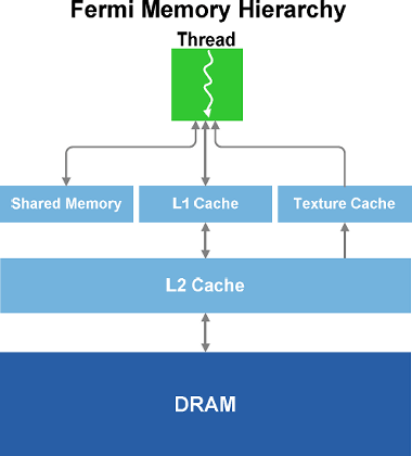 В своём новом чипе компания Nvidia снова усовершенствовала модель памяти. Теперь GF100 содержит выделенный кэш первого уровня в каждом мультипроцессоре (SM). Эта кэш-память работает совместно с разделяемой (общей) памятью мультипроцессора и дополняет её. Общая память улучшает скорость доступа к памяти для алгоритмов с предсказуемым доступом к памяти, а кэш-память L1 ускоряет доступ из нерегулярных алгоритмов, в которых адреса запрашиваемых данных заранее неизвестны.