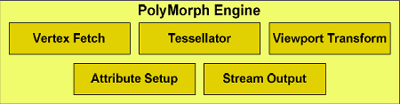 PolyMorph Engine содержит пять стадий: выборка вершин (Vertex Fetch), тесселяция, преобразование в экранные координаты (Viewport Transform), установка атрибутов (Attribute Setup), и потоковый вывод (Stream Output). Результаты, вычисленные в каждой стадии, передаются в мультипроцессор SM. Последний выполняет шейдерную программу, возвращая данные к следующей стадии PolyMorph Engine. После прохождения всех стадий результаты направляются в движки растеризации Raster Engine.