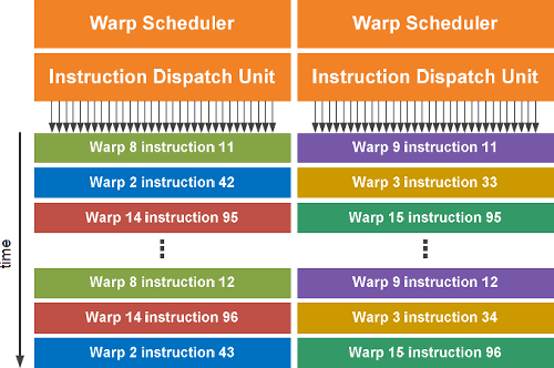Итак, мультипроцессор выполняет потоки группами по 32 штуки, такие группы называются варпами. Каждый мультипроцессор содержит два планировщика варпов (Warp Scheduler) и два диспетчера инструкций (Instruction Dispatch Unit), что позволяет одновременно выполнять по два варпа на каждом из SM.