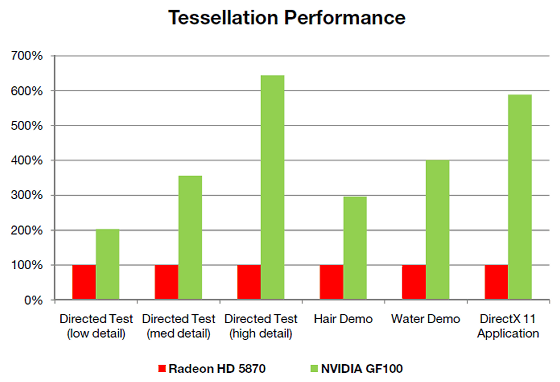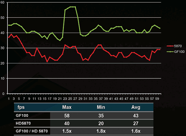 Красивой теории написано много, а где же хотя бы примерные цифры производительности? По оценке Nvidia, наличие выделенных тесселяторов в каждом из мультипроцессоров и блоков растеризации в каждом кластере GPC даёт прирост геометрической производительности GF100 вплоть до восьмикратного, по сравнению с GT200. Посмотрим, что получается на практике, при сравнении уже с лучшим из конкурентов — RADEON HD 5870: