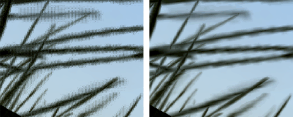 Существующие игры ограничены возможностями API и мощностью GPU по обработке геометрии, поэтому во многих случаях вместо реальной геометрии используют полупрозрачные альфа-текстуры и метод их сглаживания alpha-to-coverage. И качество сглаживания их граней зависит от количества coverage выборок. В предыдущих поколениях использовалось 4 или 8 выборок, что не обеспечивало полного избавления от алиасинга, а также добавляло бандинг (см. скриншот ниже). Теперь, с режимом 32x CSAA, новый GPU использует 32 coverage выборок, минимизирующих артефакты алиасинга.