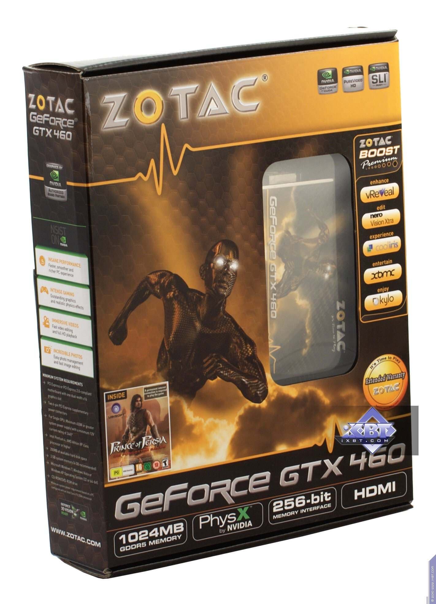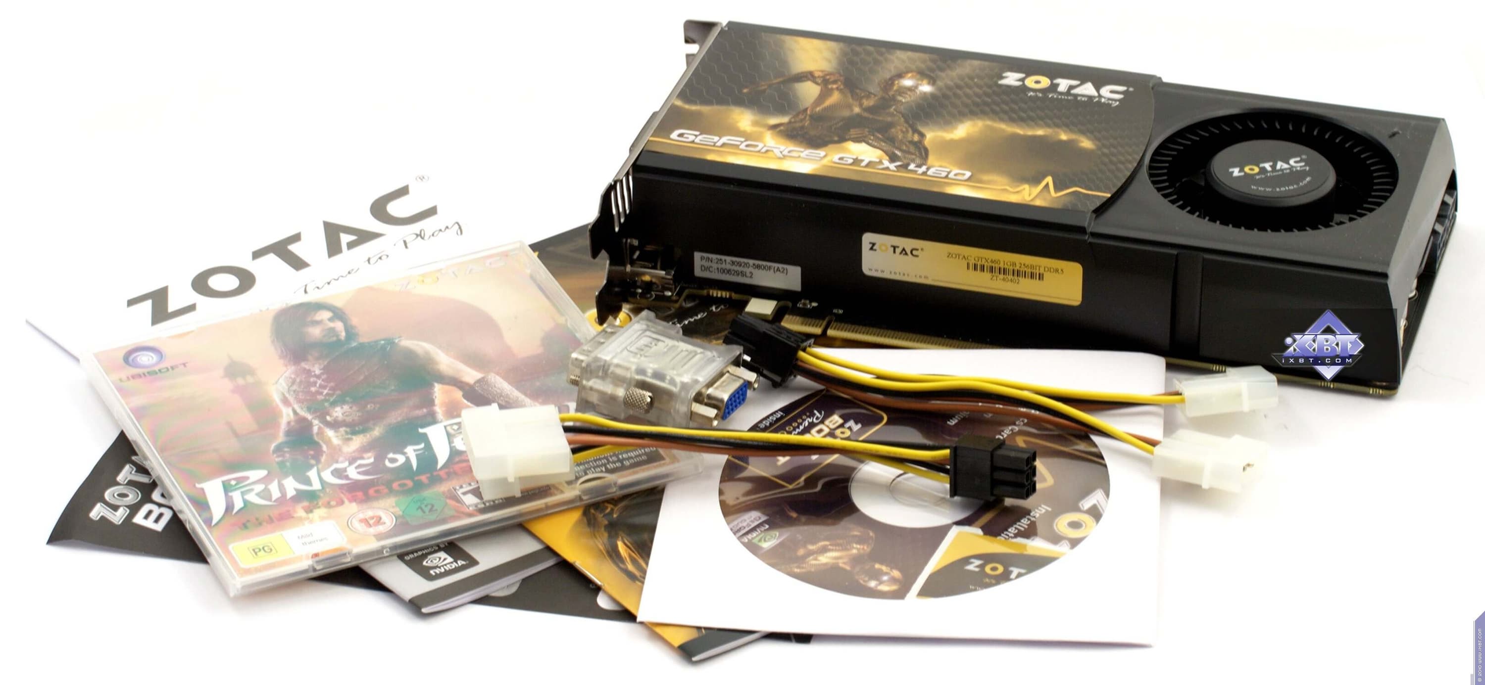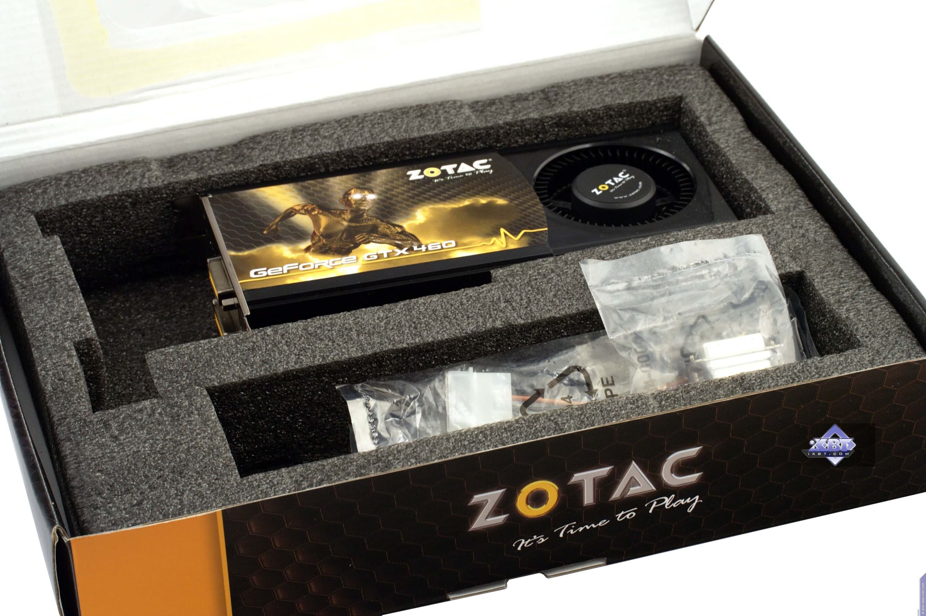 Zotac Geforce GTX460 1024 МБ 256 бит PCI-E — по сути референс-карта с 256-битной шиной и объемом памяти 1 ГБ. К сожалению, по нагреву (максимальная температура ядра — 82 °С) результаы малоприятные, впрочем, нагрев все равно не критичный. Стоит отметить хороший комплект поставки, да и упаковку.