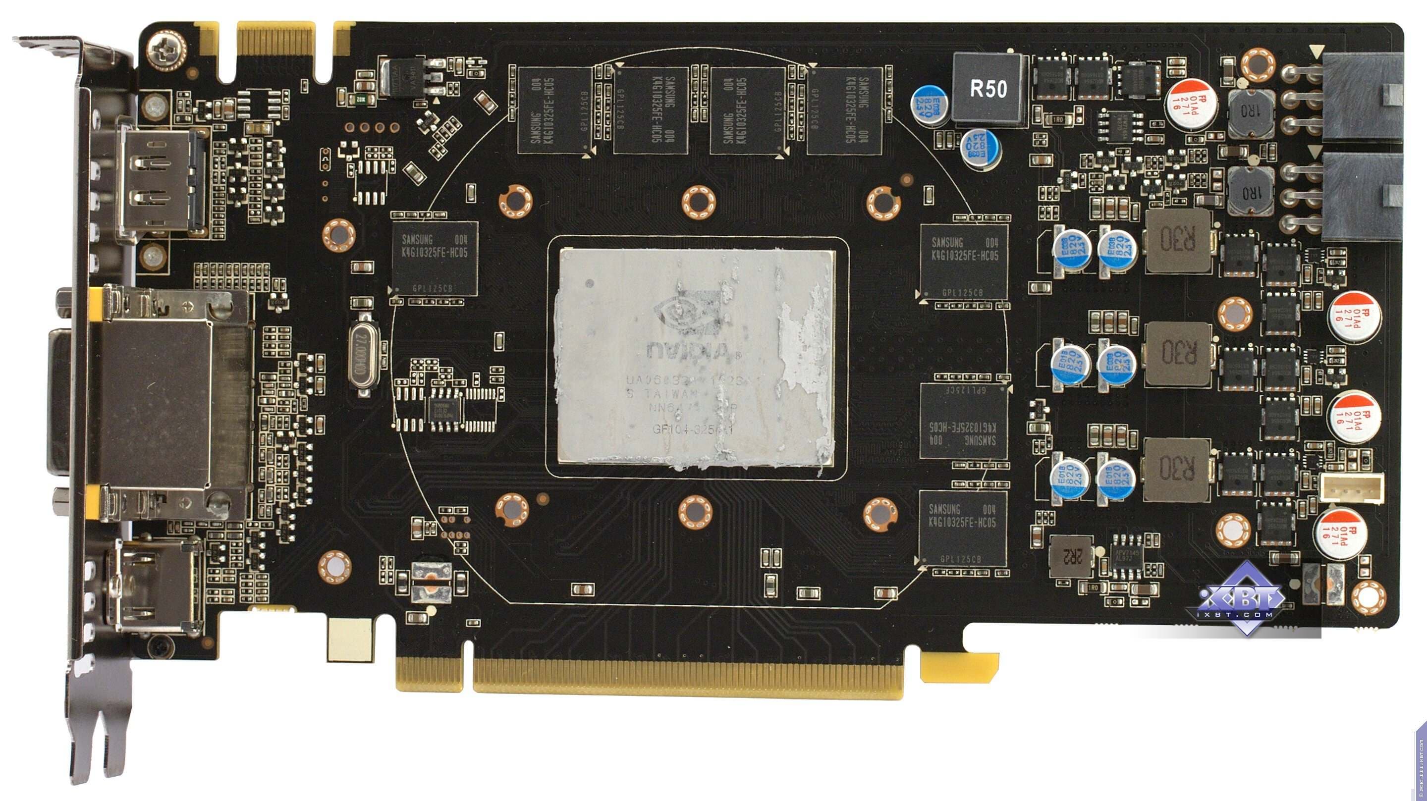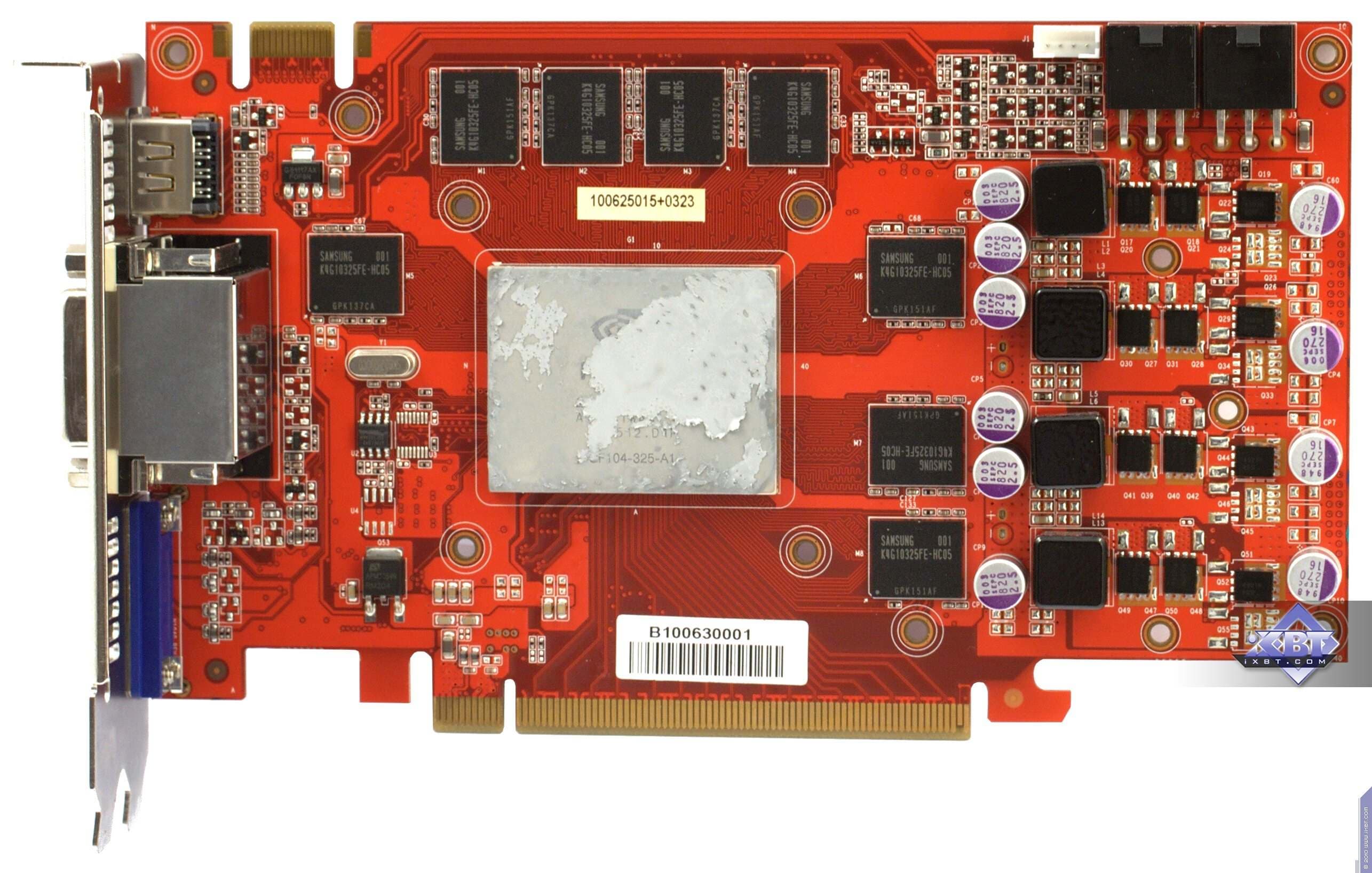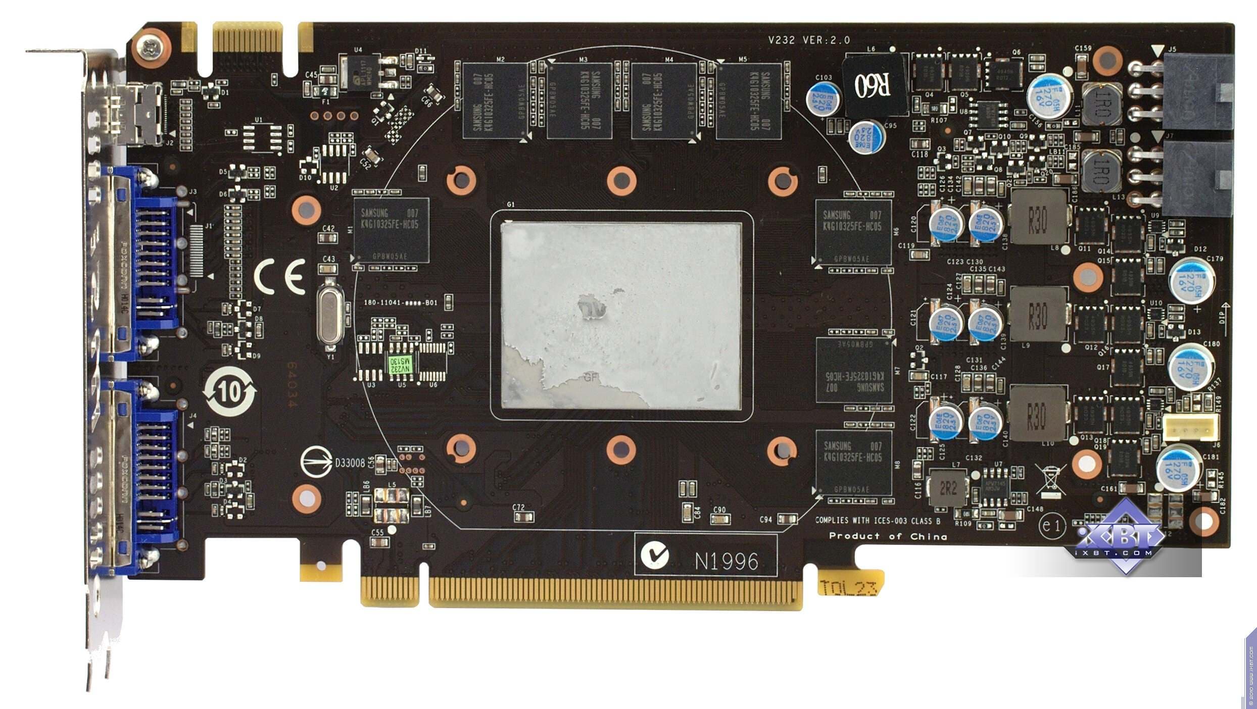 | Карта имеет 768 МБ памяти GDDR5 SDRAM, размещенной в шести микросхемах на лицевой сторонe PCB. Микросхемы памяти Samsung (GDDR5). Микросхемы расчитаны на максимальную частоту работы в 1250 (5000) МГц. | ![]() |