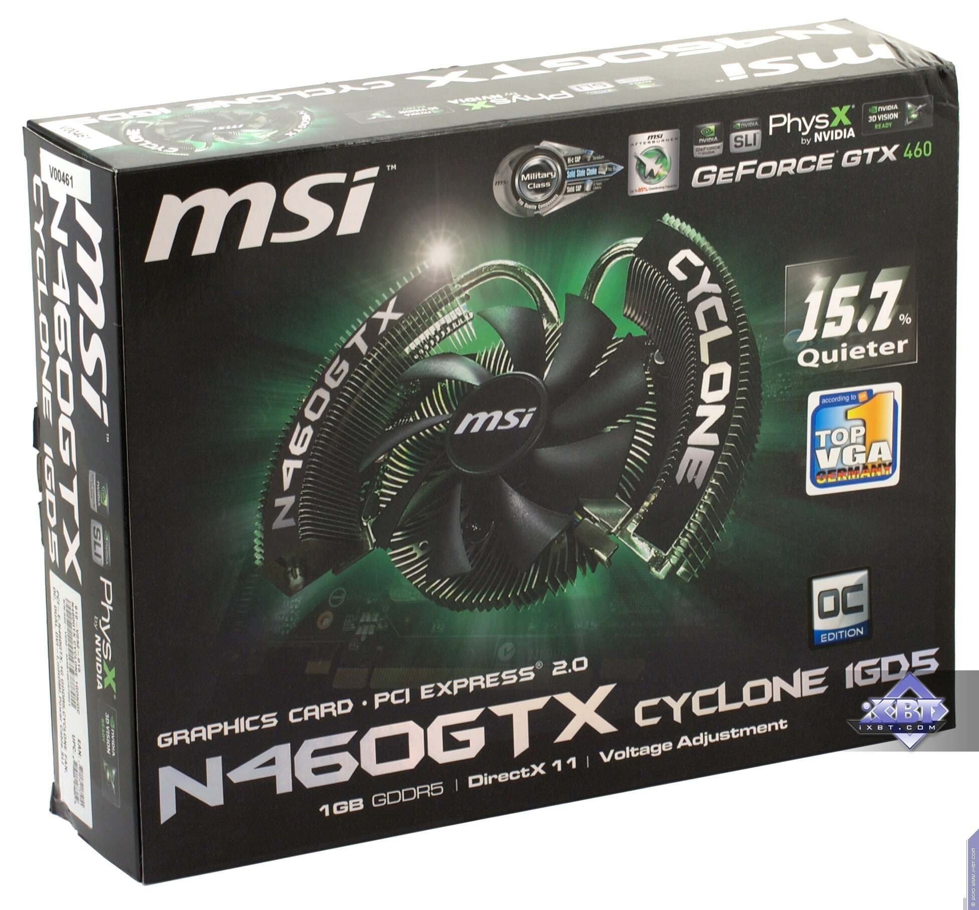 MSI Geforce GTX460 Cyclone 1024 МБ 256 бит PCI-E (N460GTX-Cyclone-1GD5/OC) — очень интересный вариант с отличной системой охлаждения (максимальный нагрев ядра — 61 °С), карта имеет отменный оверклокерский потенциал за счет не только СО, но и улучшенной разводки PCB и возможности регулировать вольтажи. Как и в случае с Inno3D, GTX 465 побит, да и 5830 тоже.