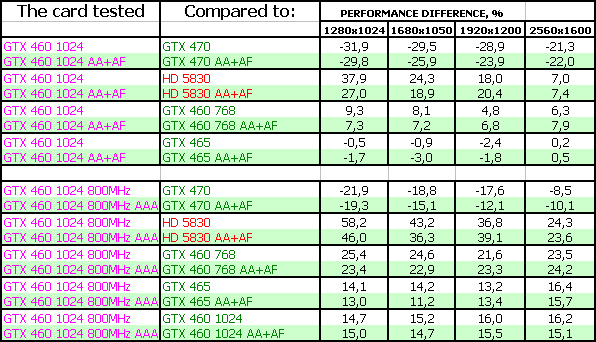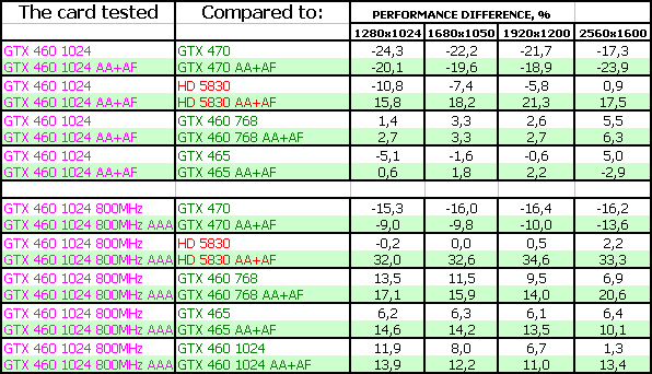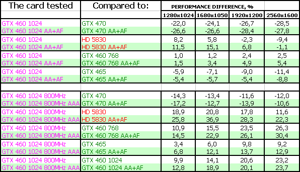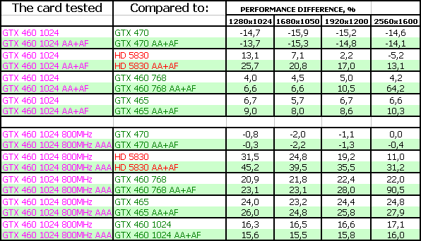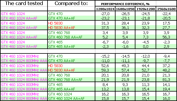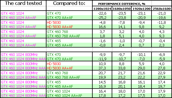 Мы покажем результаты Geforce GTX 460 768/1024 МБ на номинальных частотах, а также GTX 460 1024 МБ на самых высоких официально повышенных частотах (800/1600 МГц по ядру), когда как читатели легко могут прикинуть результаты GTX 460, работающих на промежуточных частотах.
