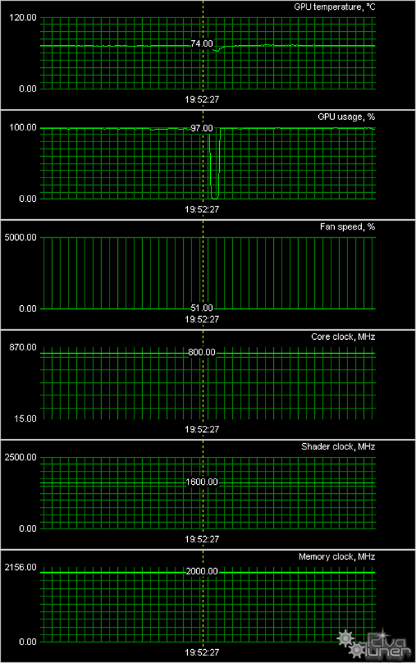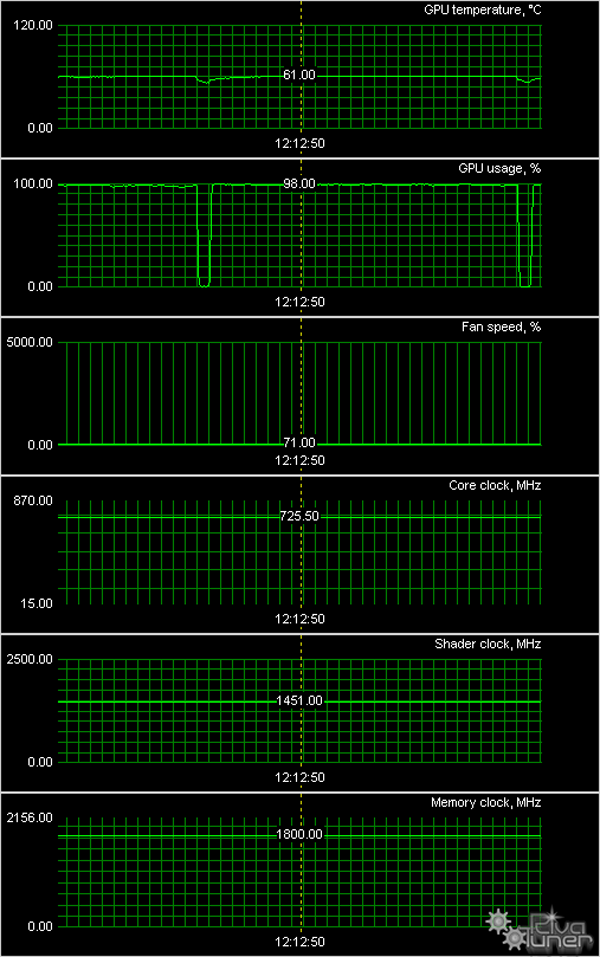 Мы провели исследование температурного режима с помощью утилиты EVGA (автор А. Николайчук AKA Unwinder) и получили следующие результаты: