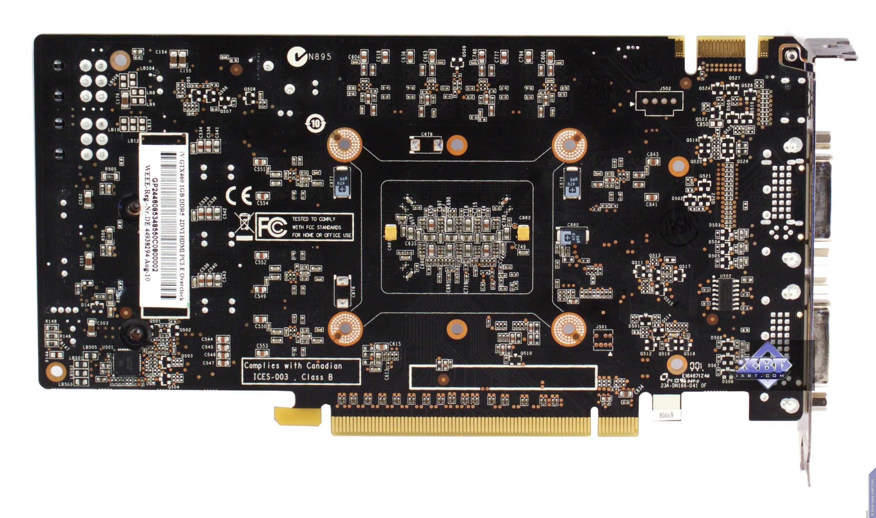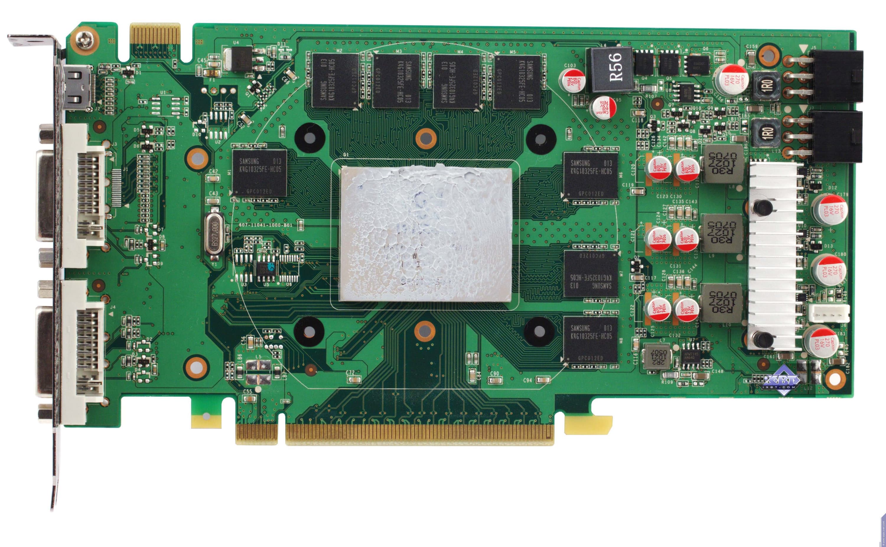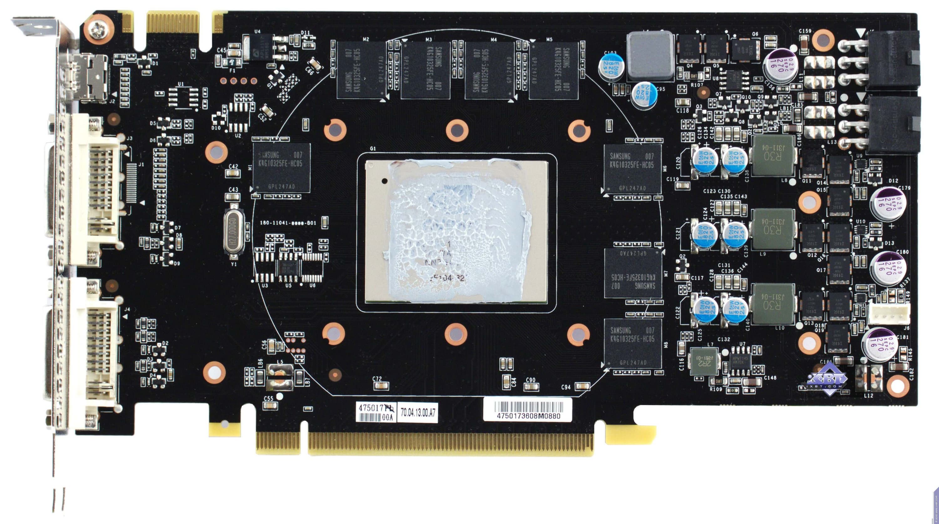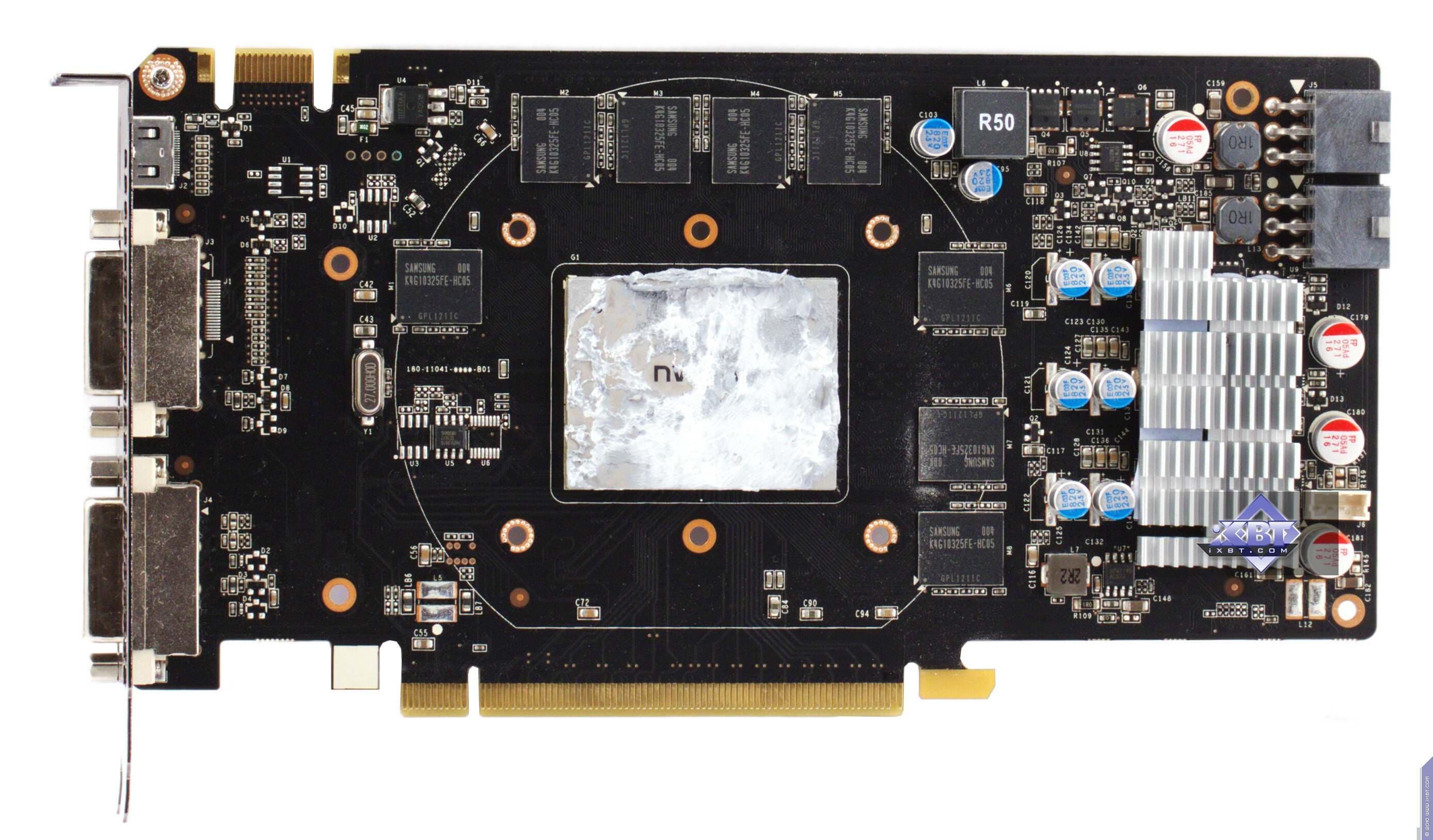| Каждая карта имеет 1024 МБ памяти GDDR5 SDRAM, размещенной в восьми микросхемах на лицевой сторонe PCB. Микросхемы памяти Samsung (GDDR5). Микросхемы расчитаны на максимальную частоту работы в 1250 (5000) МГц. | ![]() |