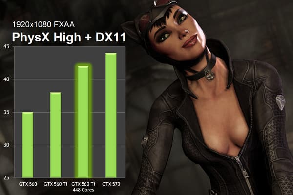 Мы проверим все наши предположения в практических разделах нашего материала — в синтетических и игровых тестах, но уже сейчас можно быть уверенным, что Geforce GTX 560 Ti 448 Cores даст возможность игры на максимальных настройках практически во всех играх. Например, в сравнительно свежей игре Batman: Arkham City представленная модель Geforce GTX 560 Ti 448 Cores показывает 42 кадра в секунду при включенных эффектах PhysX и высоких графических настройках (данные компании Nvidia):