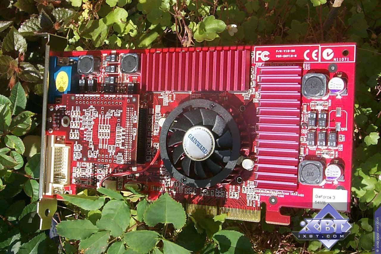 Посмотрите на снимок выше. Это тоже когда-то был Hi-End среди ускорителей трехмерной графики, Geforce 3. И более того, тогда Gainward, по сути, был единственным производителем, который использовал PCB красного цвета — более популярным тогда был зеленый. Встречались уже и желтые, и черные платы, но вот красный вошел в обиход позже, с выходом Radeon 9700 Pro — референс-карта была красного цвета, с тех пор и понеслось. Теперь уже зеленых видеокарт практически не найти :). А также посмотрите, какими простыми по отношению к нынешним топовым ускорителям были тогда видеокарты. И кулер простенький. Размеры карт остаются примерно такими же, а вот вмещается в них все больше и больше технологий.