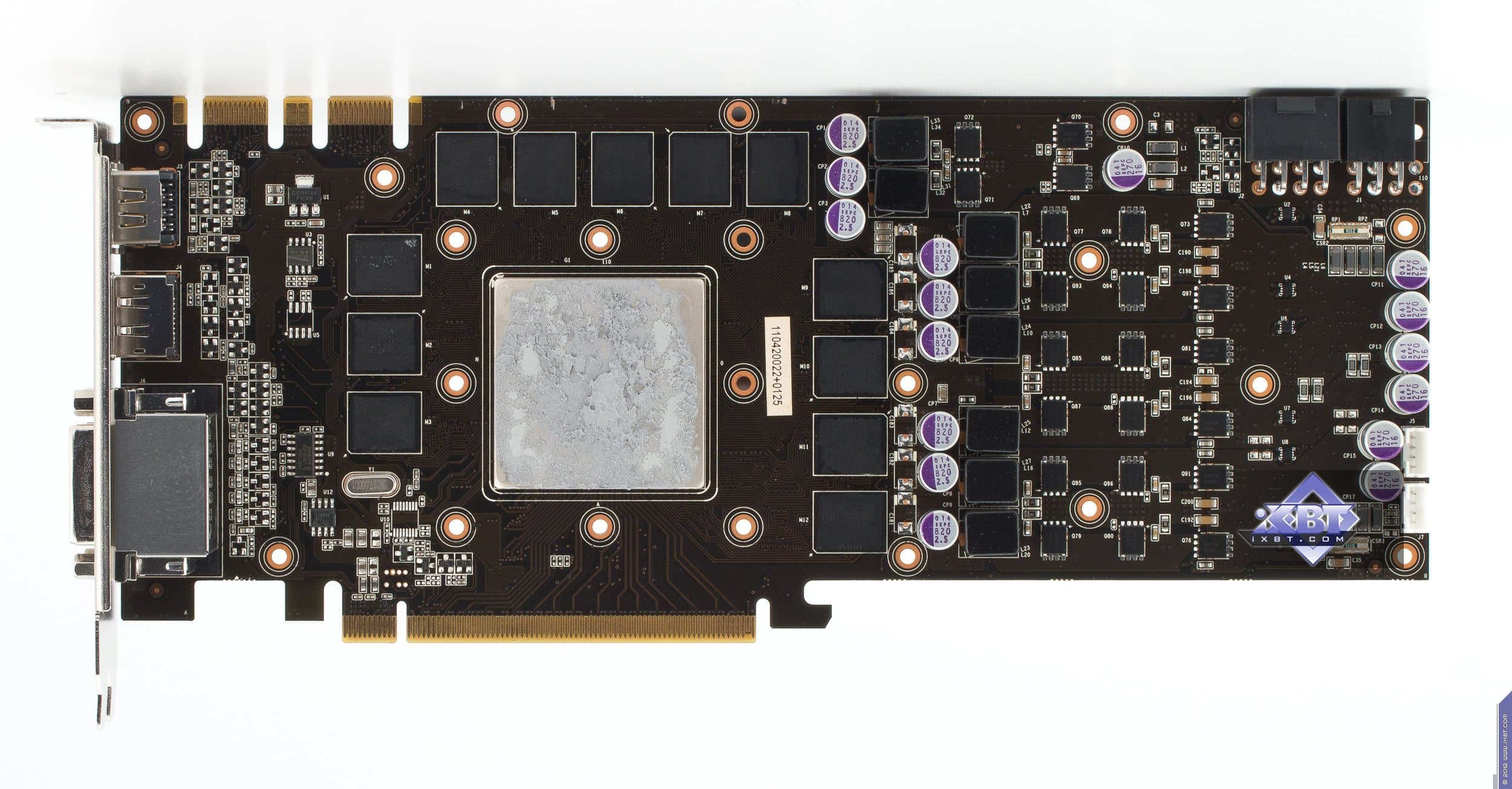 Карта имеет 1536 МБ памяти GDDR5 SDRAM, размещенной в 12 микросхемах на лицевой сторонe PCB. Микросхемы памяти Samsung (GDDR5). Микросхемы расчитаны на максимальную частоту работы в 1250 (5000) МГц. | ![]() |