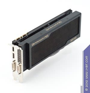 Gainward Geforce GTX 580 Phantom3 1536 МБ 384-битной GDDR5 PCI-E — очень неплохой вариант GTX 580, обладающий неординарной системой охлаждения со спрятанными вентиляторами. Да, при очень долгой нагрузке их обороты сильно растут, шум в целом ощущается, но надо отметить, что он представляет собой шелест проходящего через радиатор воздуха, а не дребезжание или гул самих вентиляторов. Поэтому шум низкочастотный и не слишком раздражающий. Видеокарта неплохо разгоняется — во всяком случае, на 900 МГц по ядру она у нас проработала весьма долго. В целом надо еще раз напомнить, что GTX 580 уходит с рынка, и потому желающие купить весьма мощный (правда, и немало потребляющий!) ускоритель могут следить за ценами. Есть сведения, что они могут упать до 300 долларов, но лишь на очень короткое время — чтобы всё распродать. И еще замечание: вся эта ценовая информация актуальна лишь на момент выхода статьи.