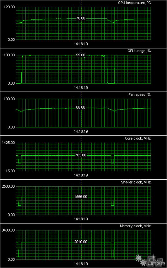Для снятия данных мониторинга карта проработала 6 часов под нагрузкой, и как видим, СО ускорителя продемонстрировала очень хорошую эффективность, так как в результате этого температура не поднялась выше 78 градусов, что для топового акселератора — просто прекрасно! И, как я уже говорил выше, в ходе такой длительной эксплуатации вентиляторы начинают работать на 60% и выше от своих максимальных оборотов, и СО в таких условиях тихой уже точно не назовешь.