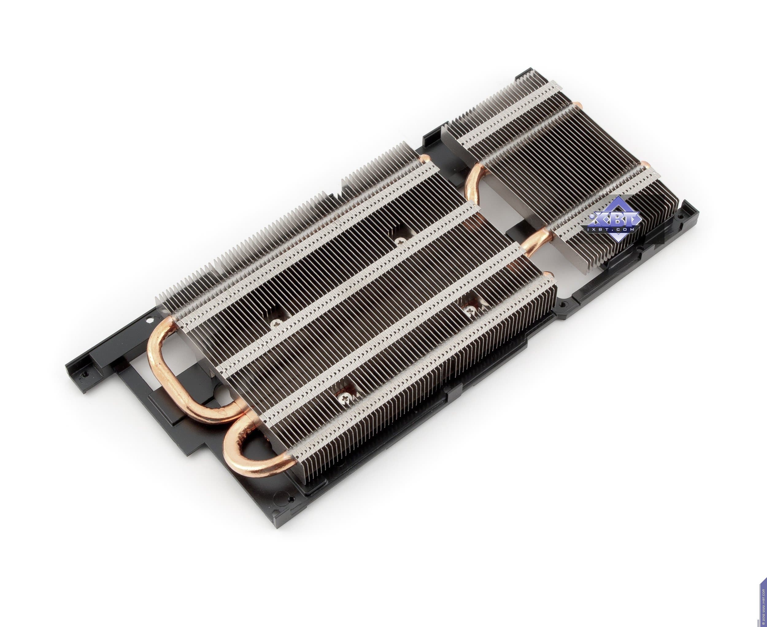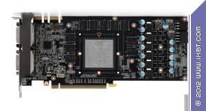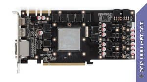 Как мы видим, все четыре продукта — результат деятельности инженеров и конструкторов той или иной компании. Начнем с Asus. Собственно, мы видим продукт GTX 570 серии DirectCu, который просто урезан по ядру и все. И более того, если всмотреться, то увидим пустые места под микросхемы памяти, а значит на PCB разведена шина не 320, а 384 бит, так что по сути перед нами все тот GTX 580 (где урезано ядро и всего 10 микросхем памяти, а не 12, поэтому имеем 1280 Мегабайт, а не 1536, и 320 бит шину, а не 384). Карта имеет особую PCB (как и все изделия из серии DirectCu), оснащенную возможностями плавного регулирования вольтажей работы ядра и памяти, а также частот. С помощью специальной утилиты, про которую я уже не один раз писал в материалах по DirectCU продуктам, можно получить совершеннно фантастический оверклокерский потенциал, благо карта оснащена гигантским и очень мощным кулером. Например, наш экземпляр разогнался с 732 до 950 МГц по ядру, также и по памяти разгон получится не менее впечатляющим - до 5500 МГц (с 3800 по умолчанию). И эти повышения частот дают феноменальные результаты: ускоритель выдает производительность на уровне GTX 580 !!! Напомню, что такой разгон возможен только на системных платах, поддерживающих PCI-E 2.0 или выше. Потому как у видеокарты всего 2 6-пиновых разъема питания, вследствие чего предельная мощность ограничена 150Вт, остальное будет добираться через слот. Также стоит особо отметить, что карта имеет только 1 Dual-Link DVI-разъем, второй - Single-Link, и он же используется для подключения VGA-мониторов с помощью адаптера DVI-to-VGA.