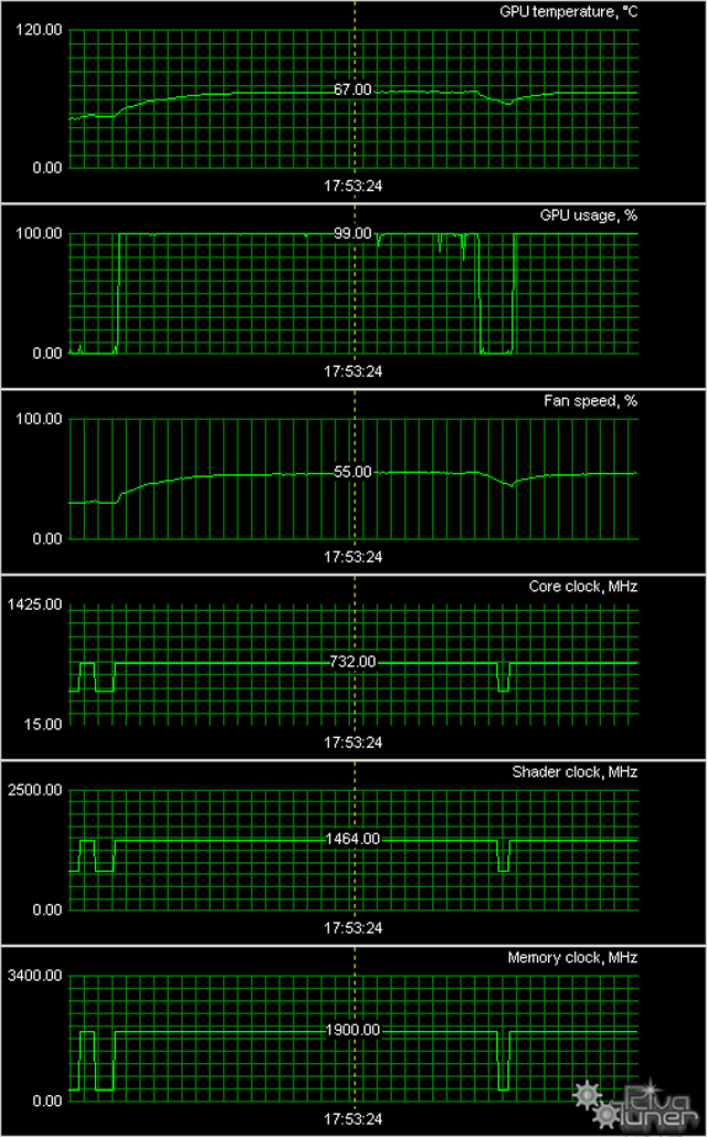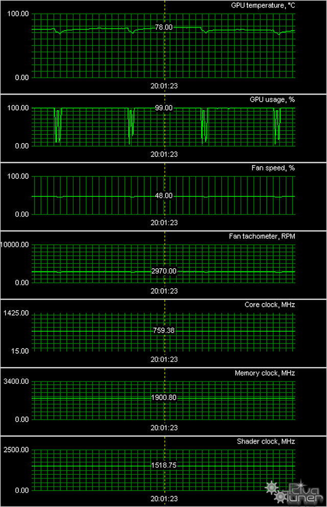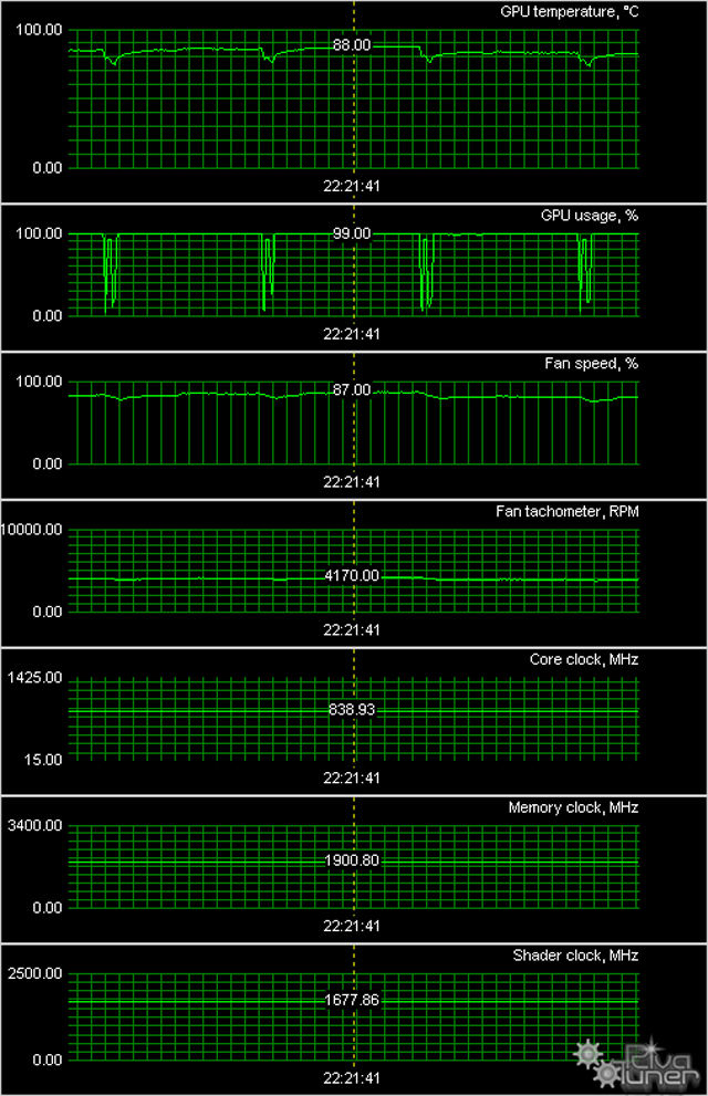 Мы провели исследование температурного режима с помощью утилиты MSI Afterburner (автор А. Николайчук AKA Unwinder) и получили следующие результаты: