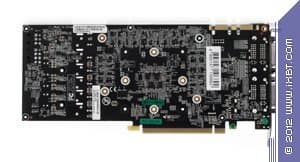 Далее изучаем акселератор от Inno3D. Он имеет печатную плату меньших размеров, чем предполагает референс-дизайн, однако по сути это сделано лишь для снижения себестоимости. Штатные частоты работы всего на 30 МГц по ядру выше номинала, что дает прирост производительности не выше 1%, поэтому можно сбрасывать со счетов. Разгон стандартный, если так можно сказать - карта устойчиво работает на частоте ядра до 810 МГц.