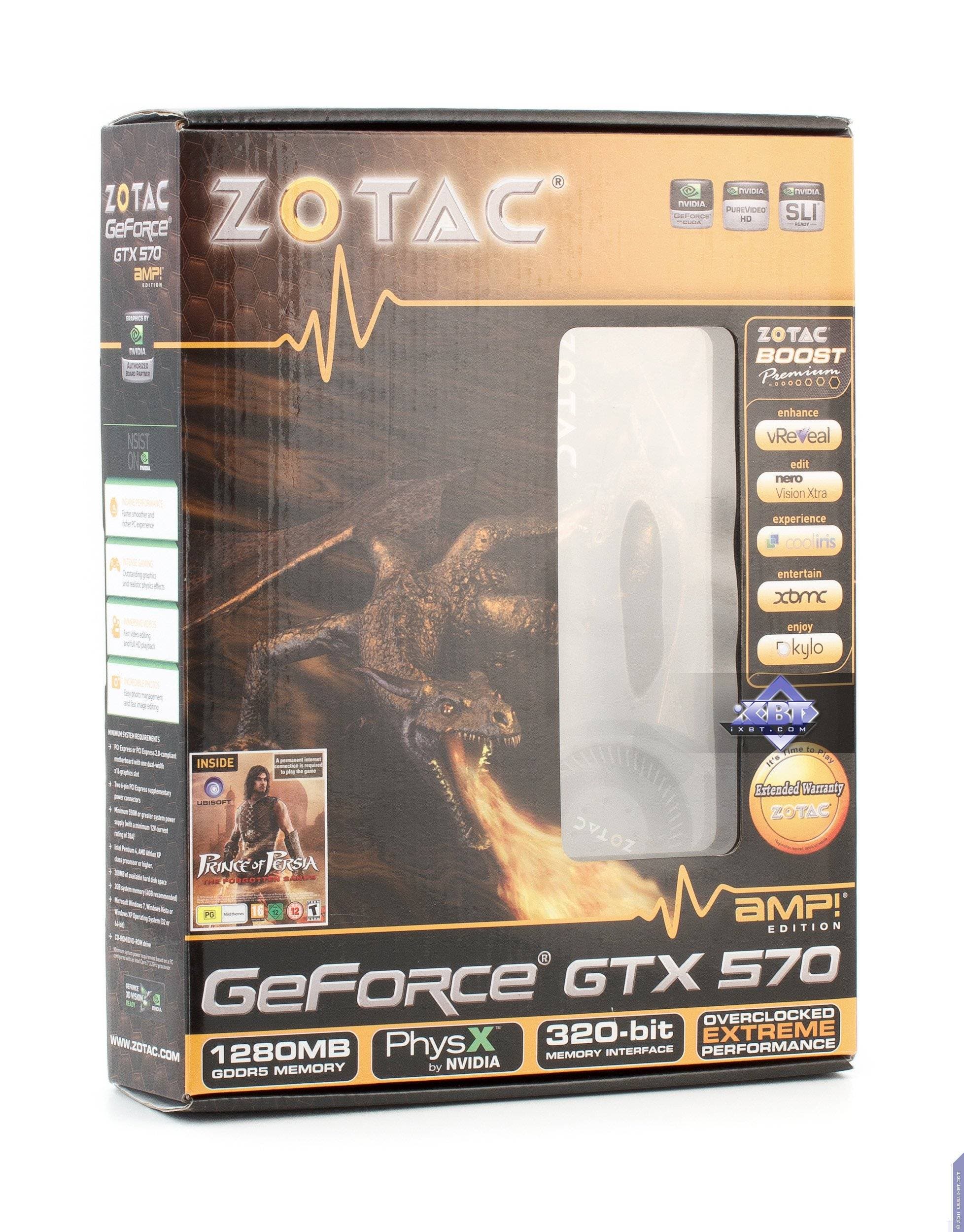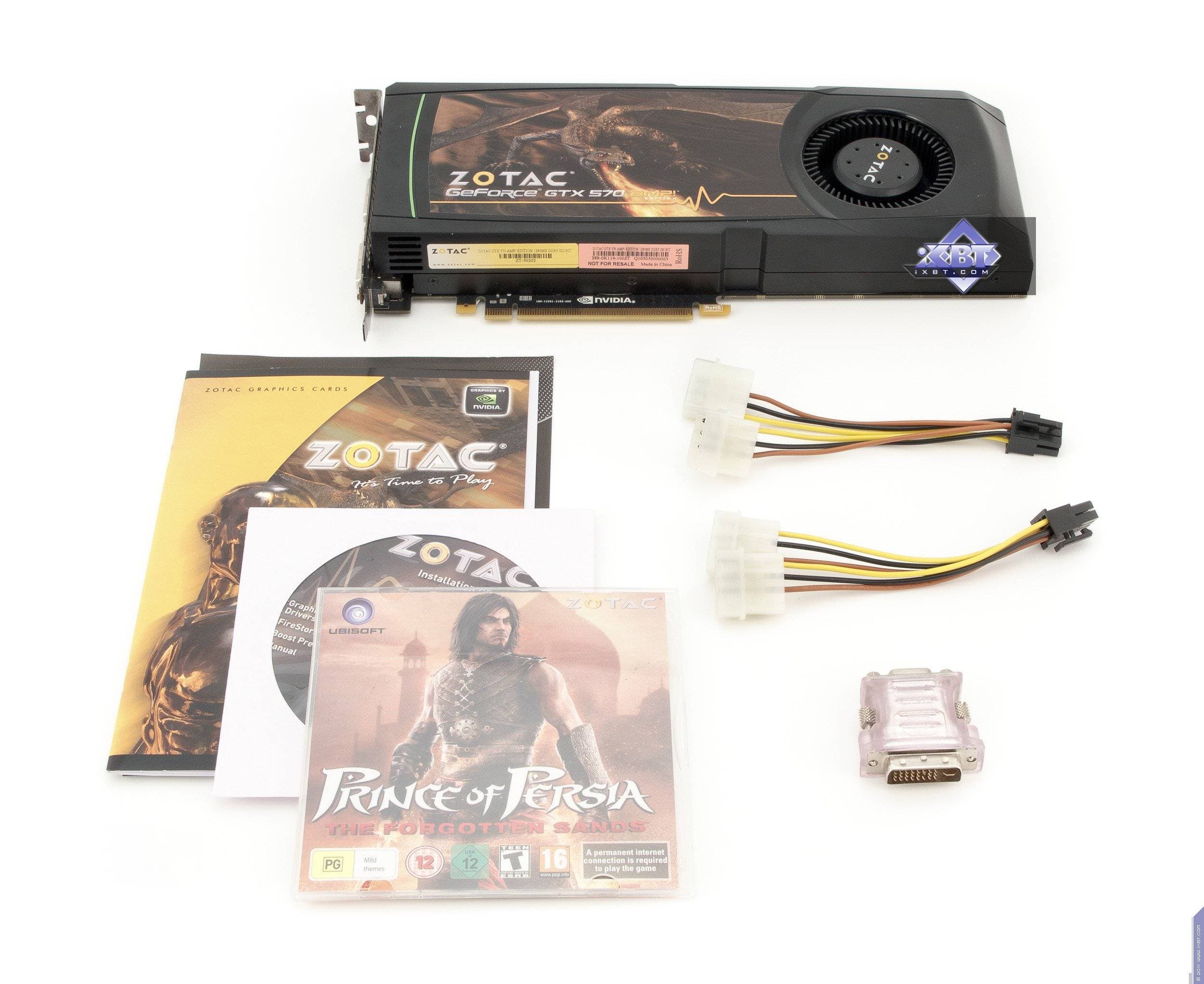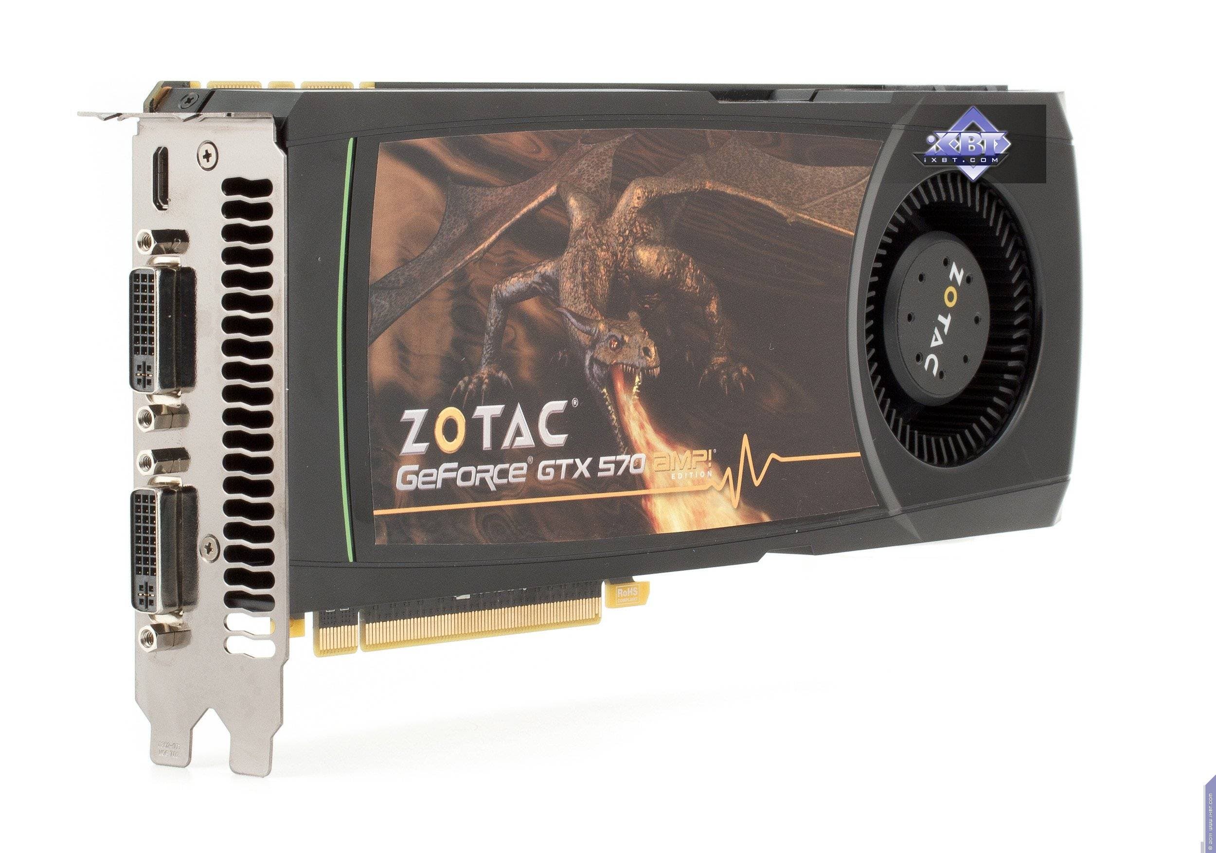 Zotac Geforce GTX 570 AMP! Edition 1280 МБ 320-битной GDDR5 PCI-E — стандартное решение на базе Geforce GTX 570, лишь частоты немного повышены, что приносит некоторую пользу.
