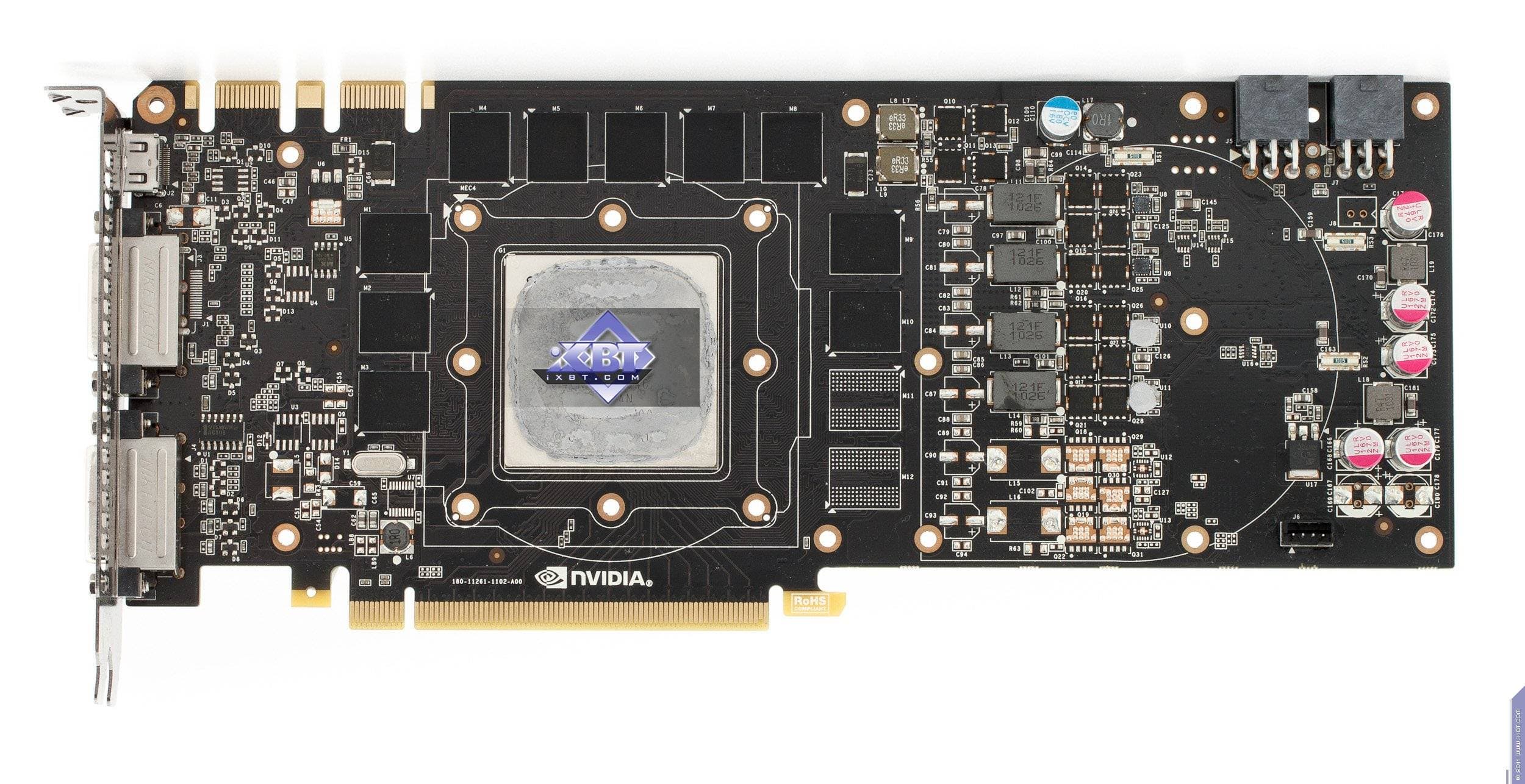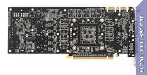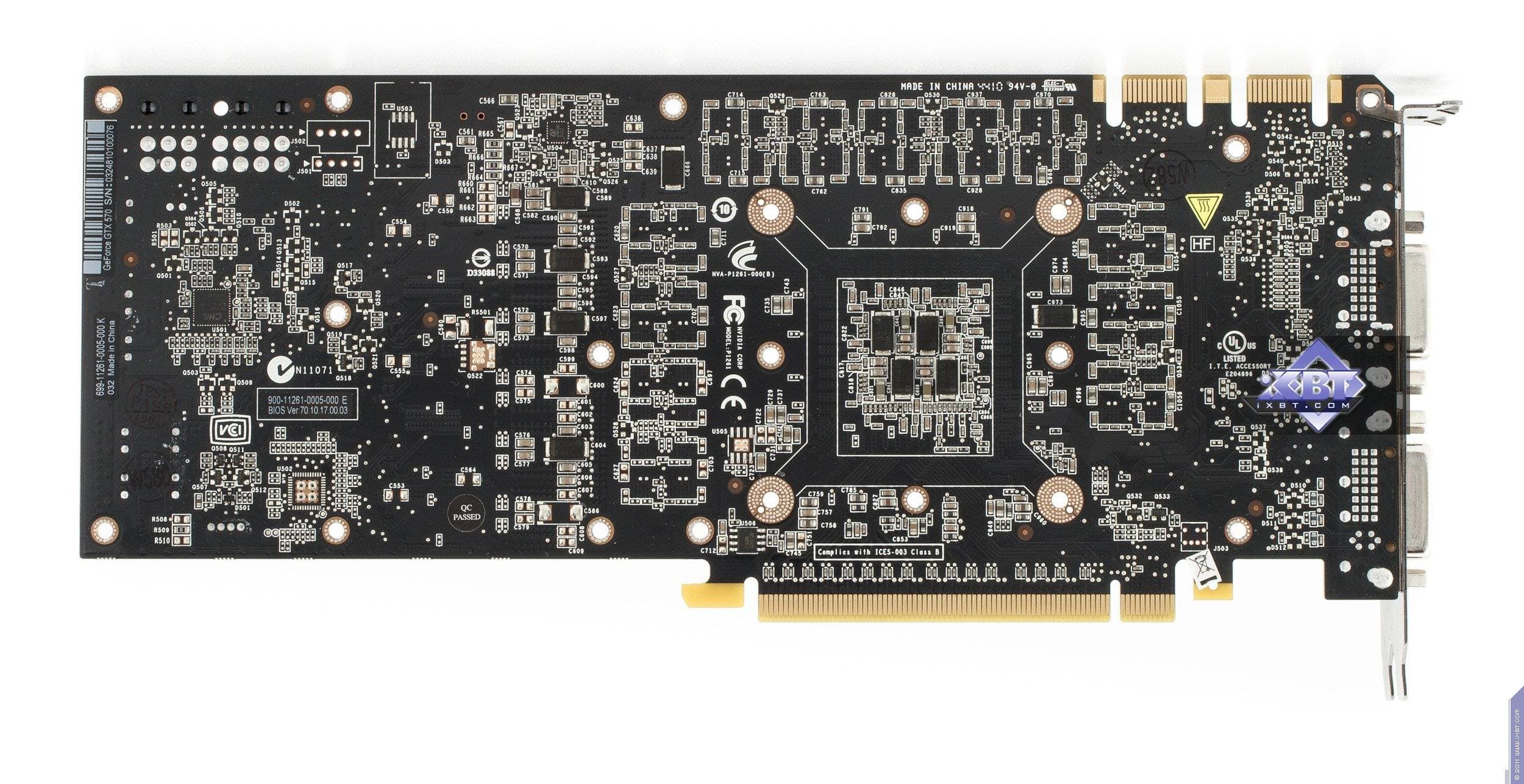 Если в 20-й раз взглянуть на эталонную карту, иной она не станет. Это и констатируем. Хочется отметить, что на плате разведена шина шириной в 384 бит, как у GTX 580. Вероятно, выпускать отдельную PCB с 320-битной шиной оказалось бы накладно, так что инженеры просто не установили на карту две микросхемы памяти, из-за чего объем памяти упал с 1536 до 1280 мегабайт, а ширина шины уменьшилась с 384 до 320 бит. Хотя мы помним, что GTX 260, имея шину в 448 бит, поначалу также производился на базе GTX 285 с 512-битной шиной (просто не были установлены 2 микросхемы памяти), но затем почти все производители перешли на выпуск GTX 260 уже на отдельной PCB, предусматривающей разводку 448-битной шины. Да и еще раньше встречались такие примеры, когда было невыгодно использовать очень дорогую PCB с более широкой шиной обмена с памятью, чем требовалось, так что выпускались свои отдельные печатные платы.