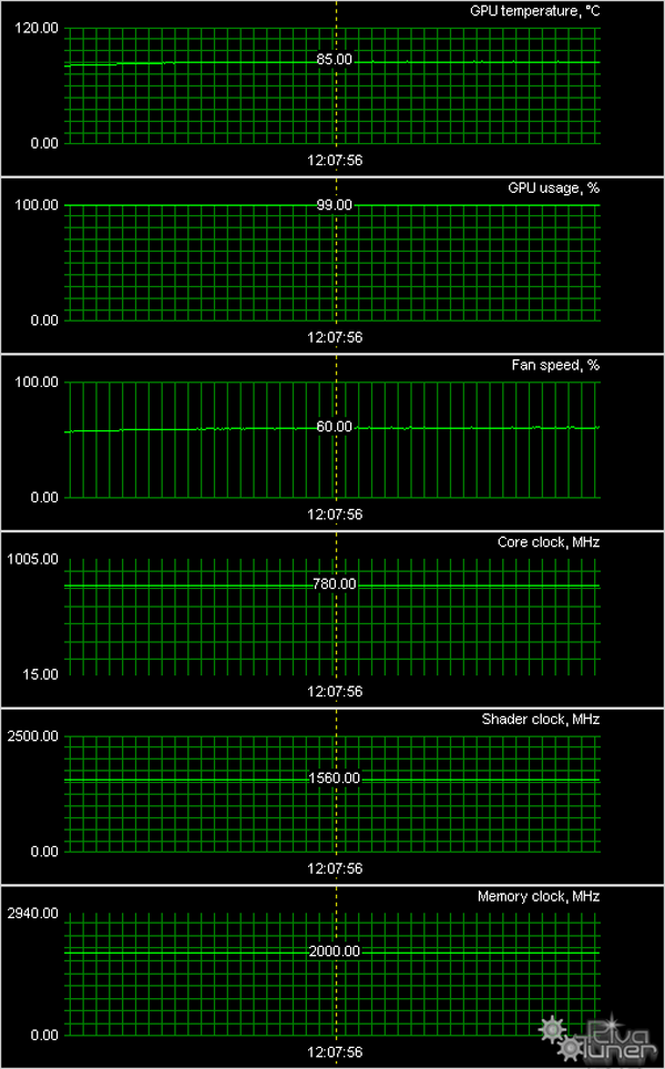 Мы провели исследование температурного режима с помощью утилиты MSI Afterburner (автор А. Николайчук AKA Unwinder) и получили следующие результаты: