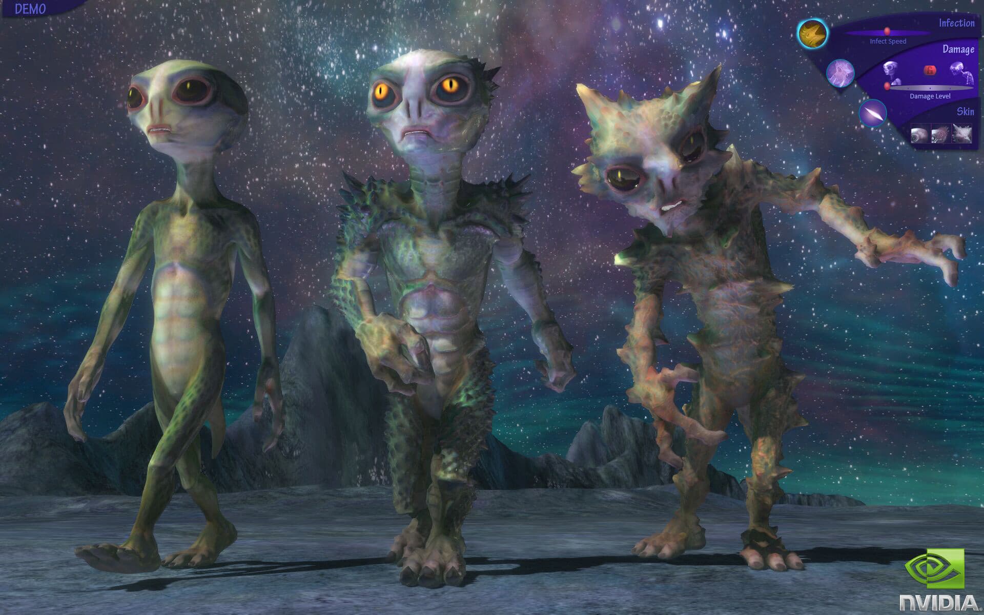 В демке используется сразу три различные карты смещения для персонажа (Normal, Spike и Fungus). Ещё четыре карты смещения используются в качестве карт повреждений, и при попадании в инопланетянина из бластера они процедурно модифицируются в реальном времени для имитации повреждений.