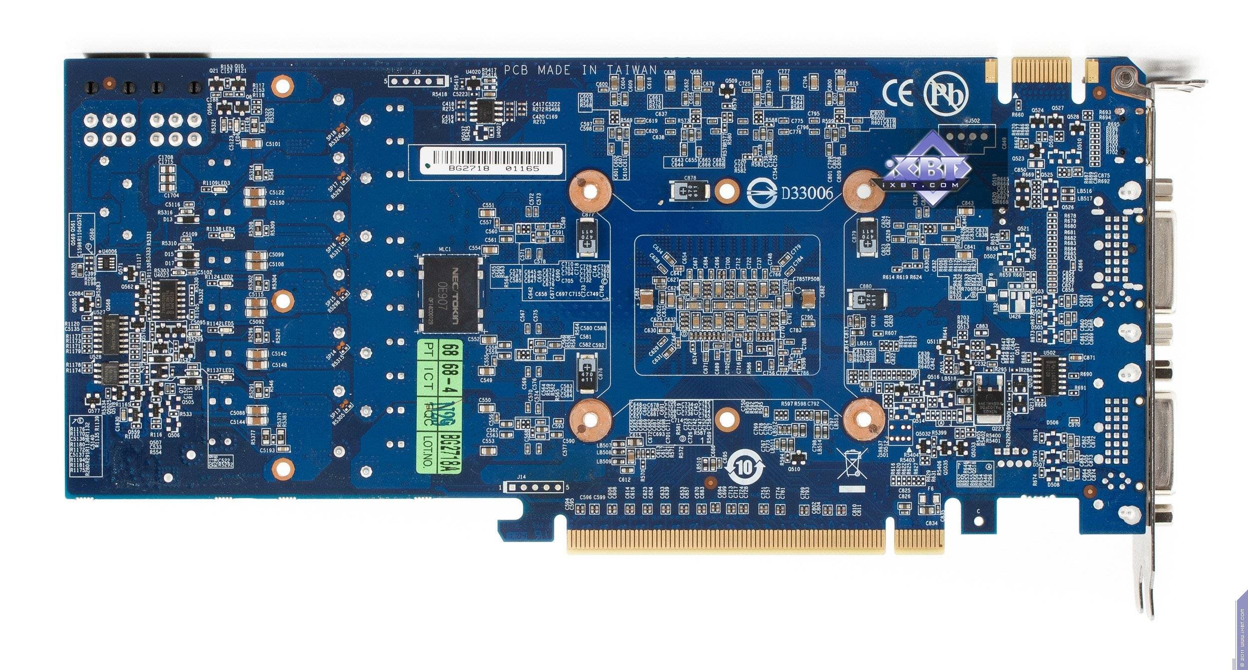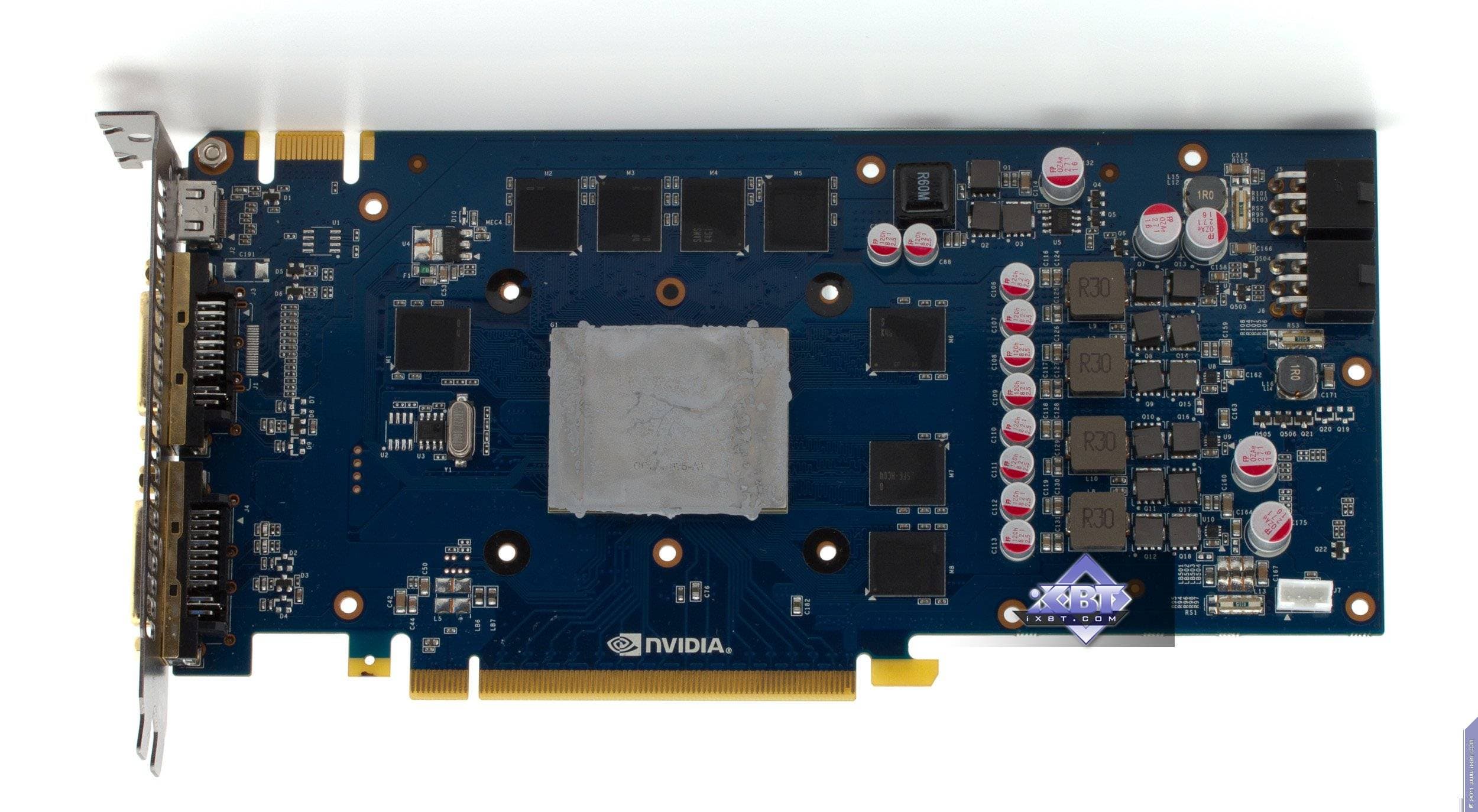 Одного беглого взгляда достаточно, чтобы понять, как сильно выделяется продукт Gainward, имея собственный дизайн всей платы. Снова мы видим, что размеры такой карты сильно меньше, чем у референсной, и это логично: кусок текстолита, помноженный на сотни тысяч карт, дает уже приличную экономию. Также переделан силовой блок. Забегая вперед, скажу, что эта трансформация дизайна карты ничуть не ухудшила такие характеристики продукта, как стабильность в работе и разгонный потенциал. Каждый раз, когда мы сталкиваемся с продуктами Gainward, получаем лишь положительные эмоции. При этом видеокарта обладает тремя разными гнездами на все случаи современной жизни (HDMI, VGA, DVI), нет разве что DP.