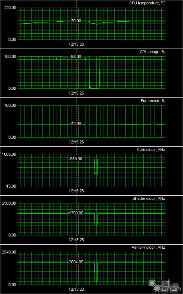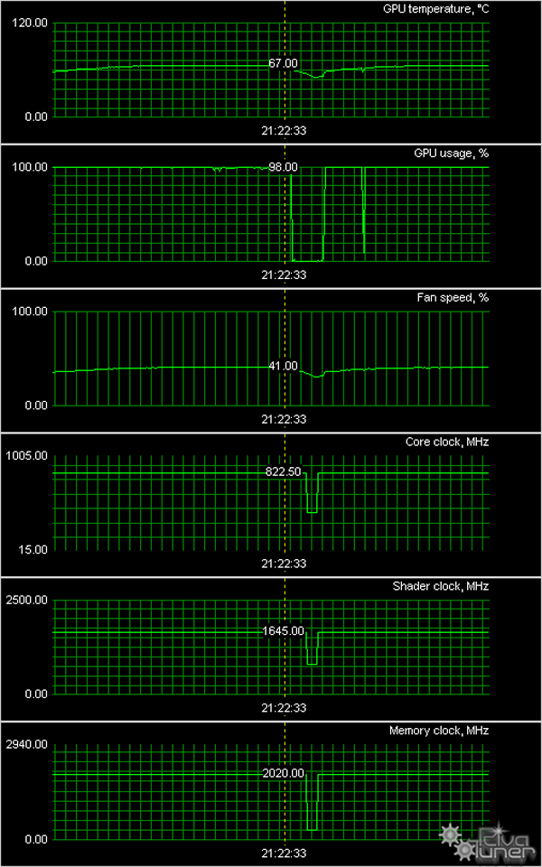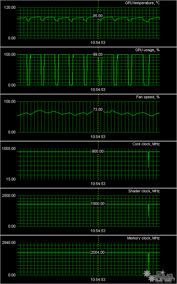 Мы провели исследование температурного режима с помощью утилиты MSI Afterburner (автор А. Николайчук AKA Unwinder) и получили следующие результаты: