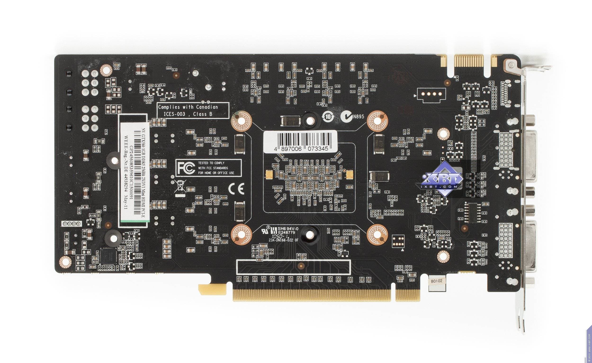 Одного беглого взгляда достаточно, чтобы понять, как сильно выделяется продукт Palit, имея собственный дизайн всей платы (впрочем, он очень схож с тем, что мы видели ранее у Gainward). Снова мы видим, что размеры такой карты сильно меньше, чем у референсной, и это логично: кусок текстолита, помноженный на сотни тысяч карт, дает уже приличную экономию. Также переделан силовой блок. Забегая вперед, скажу, что эта трансформация дизайна карты ничуть не ухудшила такие характеристики продукта, как стабильность в работе и разгонный потенциал. При этом видеокарта обладает тремя разными гнездами на все случаи современной жизни (HDMI, VGA, DVI), нет разве что DP.