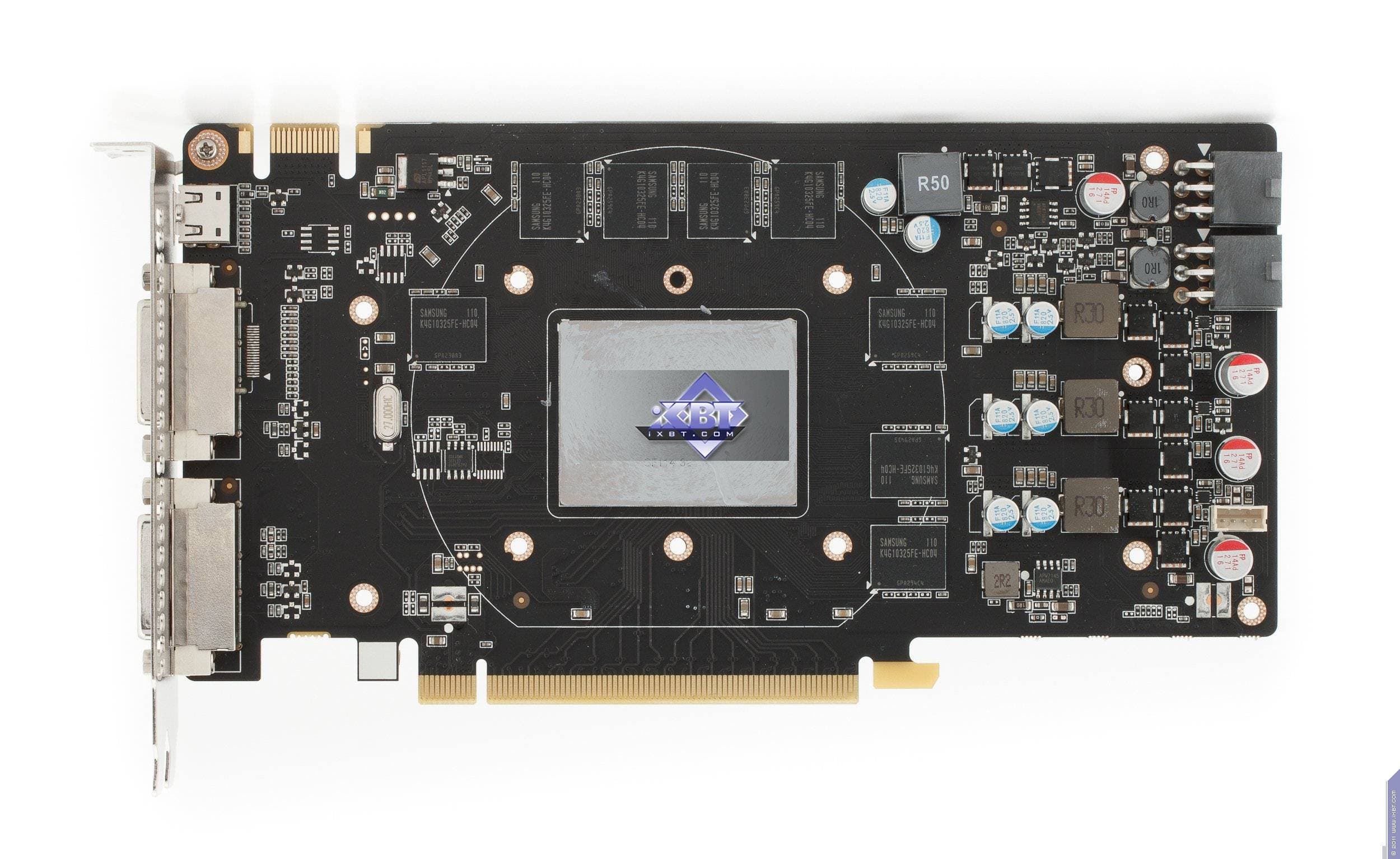 Каждая карта имеет 1024 МБ памяти GDDR5 SDRAM, размещенной в восьми микросхемах на лицевой сторонe PCB. Микросхемы памяти Samsung (GDDR5). Микросхемы расчитаны на максимальную частоту работы в 1250 (5000) МГц. | ![]() |