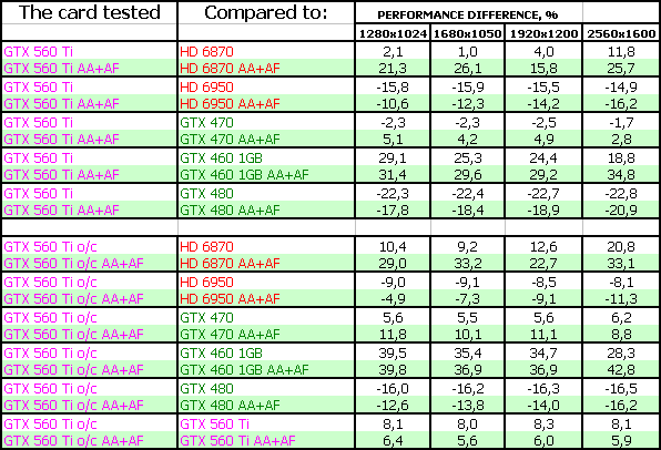 Наше предфинальное заключение: если стомость GTX 560 Ti будет рядом с Radeon HD 6870 (пусть даже и чуть выше), то, несомненно, надо покупать GTX 560. Эта карта реально отправила на покой Geforce GTX 470 и в целом семейство GF100 — 470/480 морально умерло и ушло в историю. К тому же, как мы могли уже убедиться, GTX 560 Ti очень хорошо разгоняются, и потому мы не исключаем массового появления на прилавках от партнеров Nvidia всевозможных Turbo-версий с повышенными частотами, а, следовательно, такие карты могут уже догонять даже 6950. Однако если цена будет столь высокой, как ее рекомендуют, то с той же уверенностью можем сказать, что надо покупать иные карты.