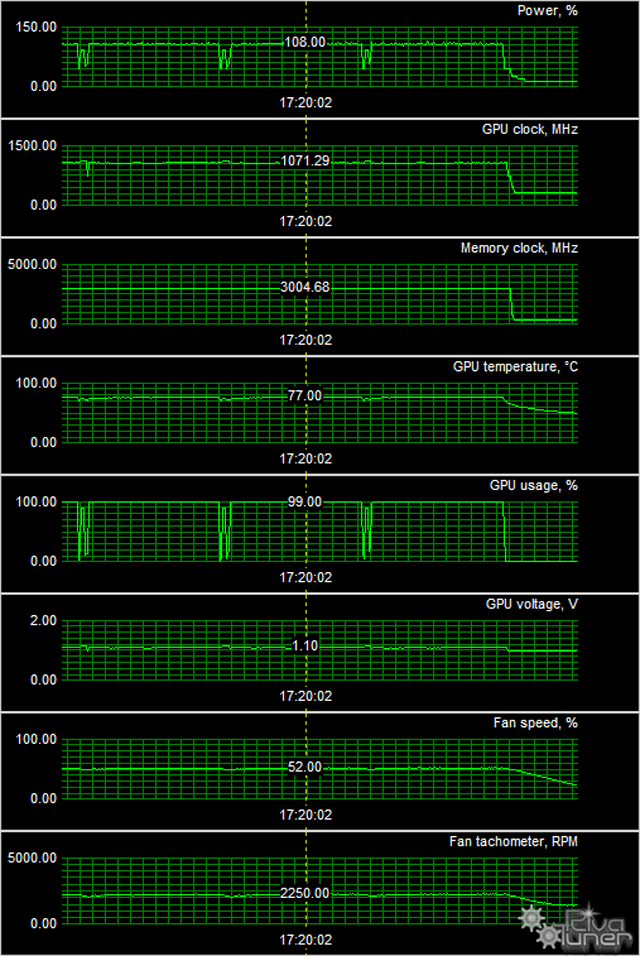 После 6-часового прогона под нагрузкой мы видим, что максимальная температура не превысила 77 градусов, что для такого рода ускорителя очень хороший результат. Однако всё это ценой того, что СО всё же весьма ощутима в акустическом плане (конечно, не песни поет, но изображает ветер перед грозой).