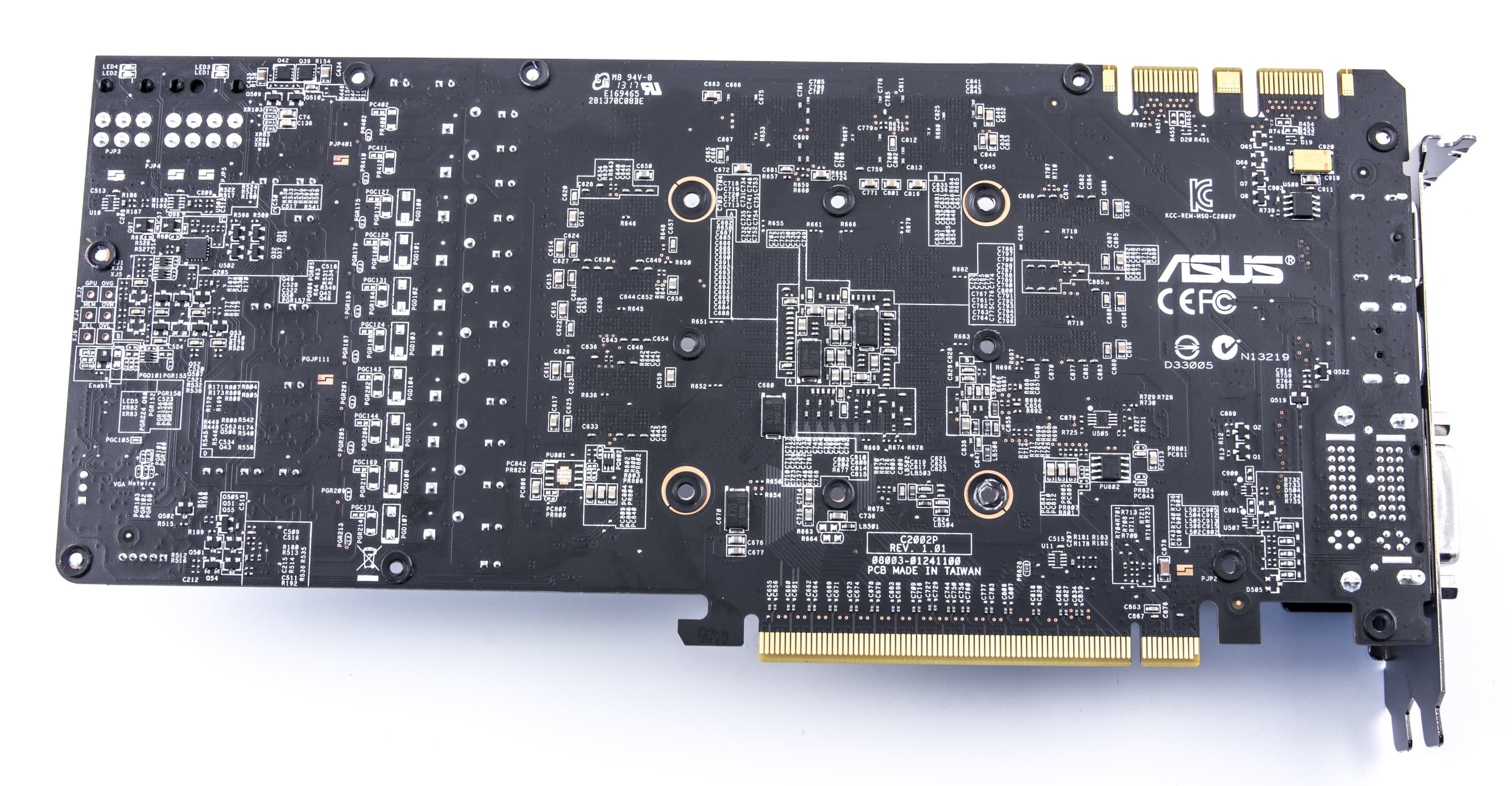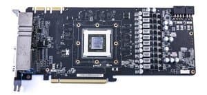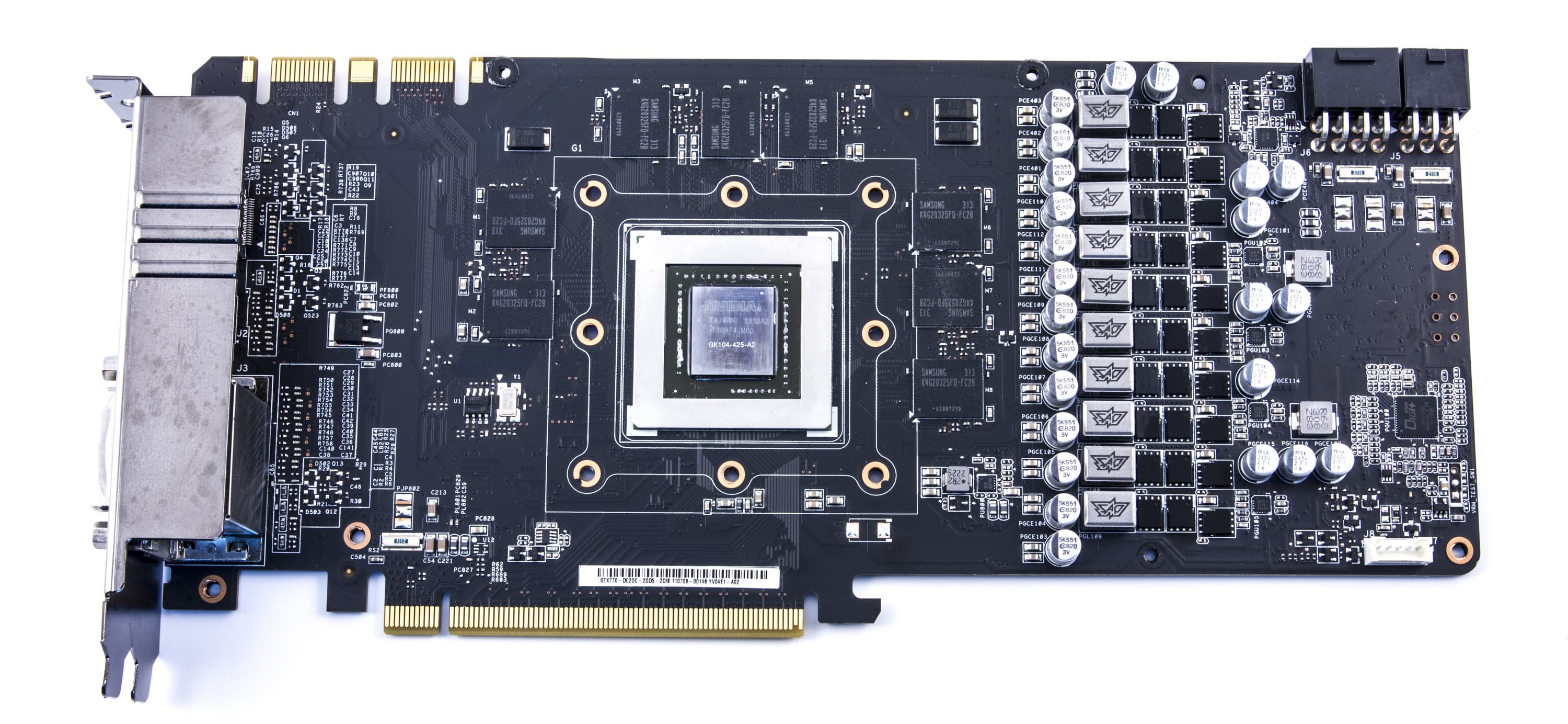 Asus не был бы Asus, если бы не переделал карту: от эталонного дизайна осталось лишь расположение микросхем памяти вокруг ядра. Мы знаем, что GTX 770 — это, по сути, бывший GTX 680, уже снятый с производства. Так что неудивительно, что PCB по большому счету такая же. Однако посмотрите на эти 10(!) фаз в схеме питания! Карта имеет дополнительную подпитку через 6-контактный и 8-контактный разъемы, что позволяет увеличить оверклокерский потенциал ускорителя.