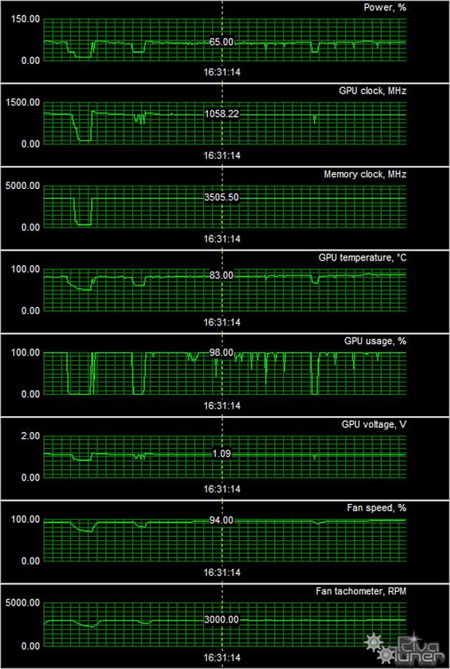 Мы видим, что после 6-часового прогона под нагрузкой максимальная температура не превысила 83 °C, что для топового ускорителя более чем приемлемо. Однако шумновато, да.