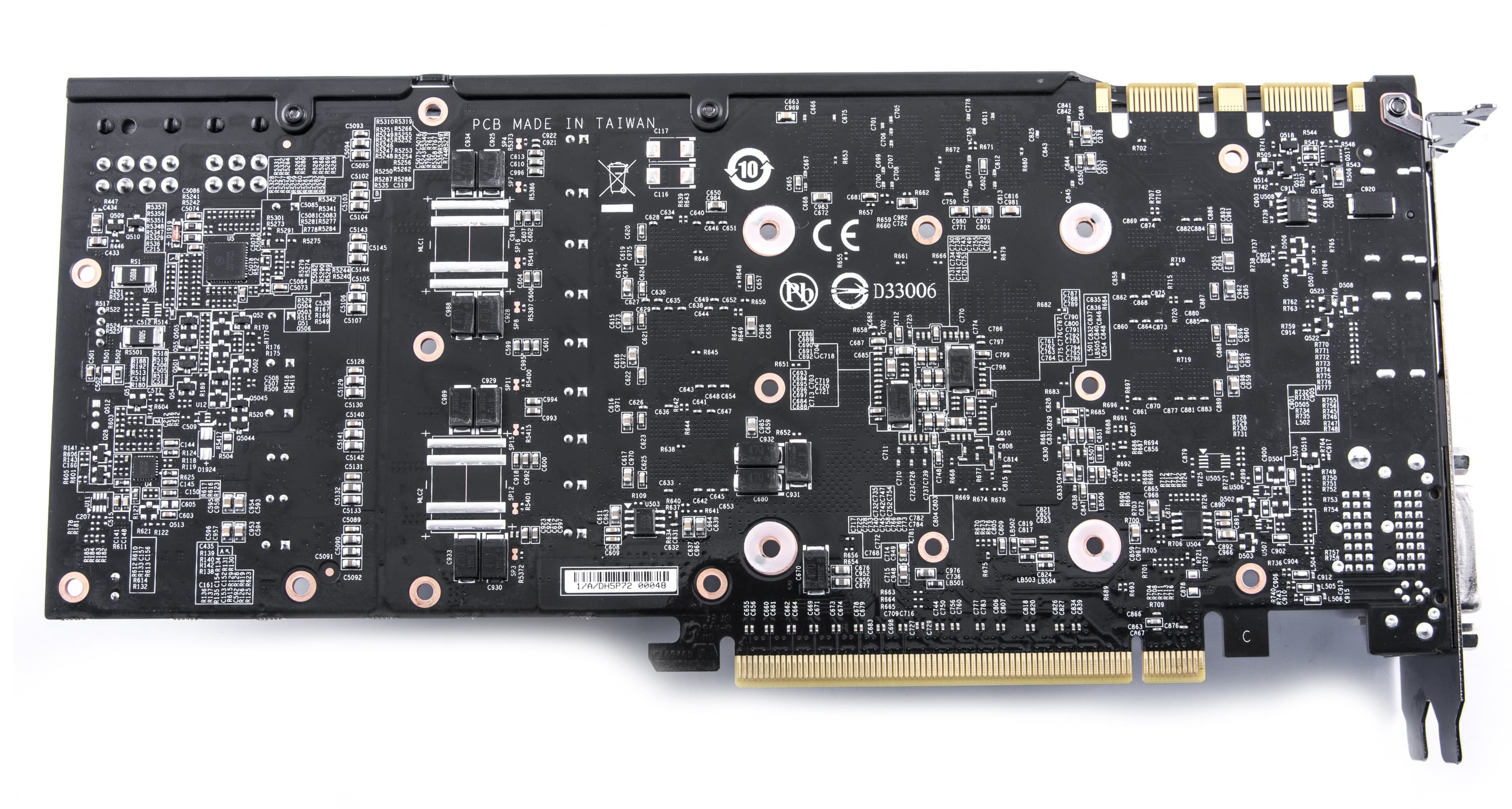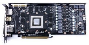 Удивительное рядом! Все привыкли к тому, что карты Gigabyte с их фирменными PCB выполнены в синем цвете, а тут уже в который раз мы видим черный текстолит. Тем не менее, это карты именно Gigabyte, а не купленные референс-платы. Некоторые исследования дали почву полагать, что компания разместила заказ на производство карт на мощностях Foxconn, который, как известно, держит только черный лак для покраски (все карты и платы, выпускаемые Foxconn, черного цвета). Правда, до стадии выпуска над PCB все же поработали инженеры из Gigabyte. Можем отметить, что снова, как и в случае с Asus, основные изменения внесены в блок питания. Да, схема питания получила 8 фаз, установлен улучшенный цифровой контроллер. Таким образом, продукт получил отличный оверклокерский потенциал. Разумеется, при производстве PCB были использованы Durable-технологии Gigabyte по экранированию платы, а также иные тонкости проектирования для снижения нагрева карты в процессе работы. Ускоритель имеет дополнительную подпитку через 6-контактный и 8-контактный разъемы.
