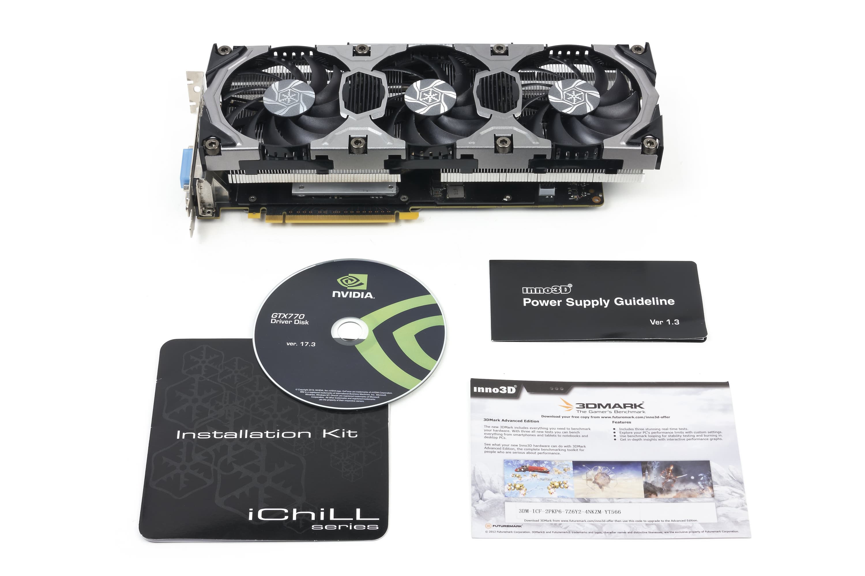 Inno3D Geforce GTX 770 iChill 2048 МБ 256-битной GDDR5 PCI-E — превосходный вариант GTX 770, имеющий сильно повышенные частоты работы, что серьезно увеличивает его производительность, а также отличную СО, сохраняющую низкий уровень шума даже при высокой нагрузке в 3D. Также к плюсам карты стоит отнести возможность разборки СО для чистки без снятия с текстолита, а также доступный демонтаж одного из вентиляторов. Минусом являются громоздкие размеры ускорителя, занимающего 3 слота в системном блоке и имеющего длину в 30 см. Еще раз стоит сказать, что на середину января 2014 года этот продукт имеет самый высокий рейтинг полезности, то есть максимальную отдачу на каждый потраченный рубль (речь идет только о ценовом диапазоне 300—380 долларов).