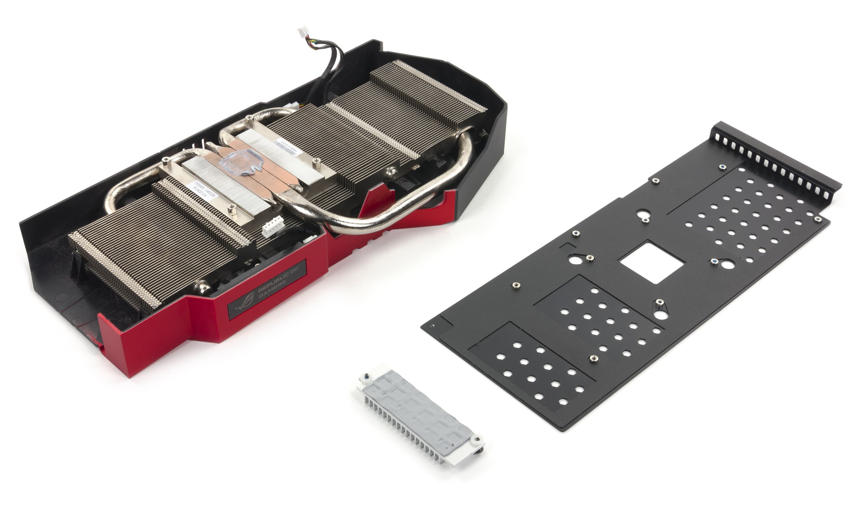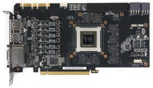 Данный продукт тоже сильно отличается от референс-карты, и не только комплектацией вдвое большим объемом памяти, что потребовало размещения микросхем памяти на оборотной стороне PCB. У карты сильно переработан блок питания: во-первых, схема питания стала 8-фазной с современными металлическими конденсаторами, что позволяет изменять напряжение питания ядра и памяти с ювелирной точностью (для этого следует использовать фирменную утилиту GPU Tweak, о которой я не раз уже писал). Это все очень понравится энтузиастам-оверклокерам. Во-вторых, силовой блок поддерживает более высокие лимиты потребляемой мощности, что опять же на руку любителям разгона. К тому же частоты работы карты очень сильно повышены изначально, что обеспечивает ей производительность, сравнимую с конкурентами более высокого уровня.