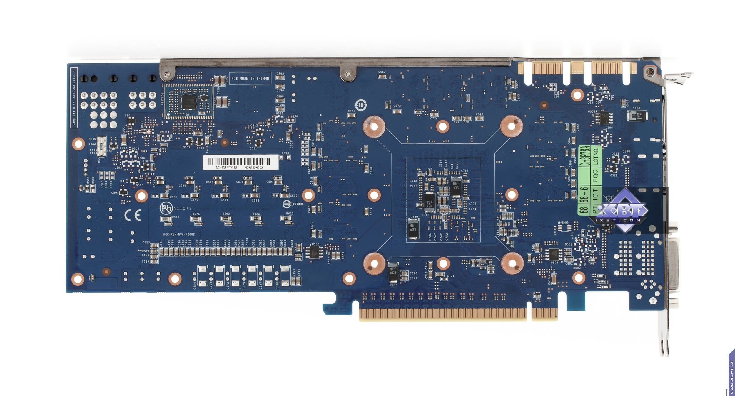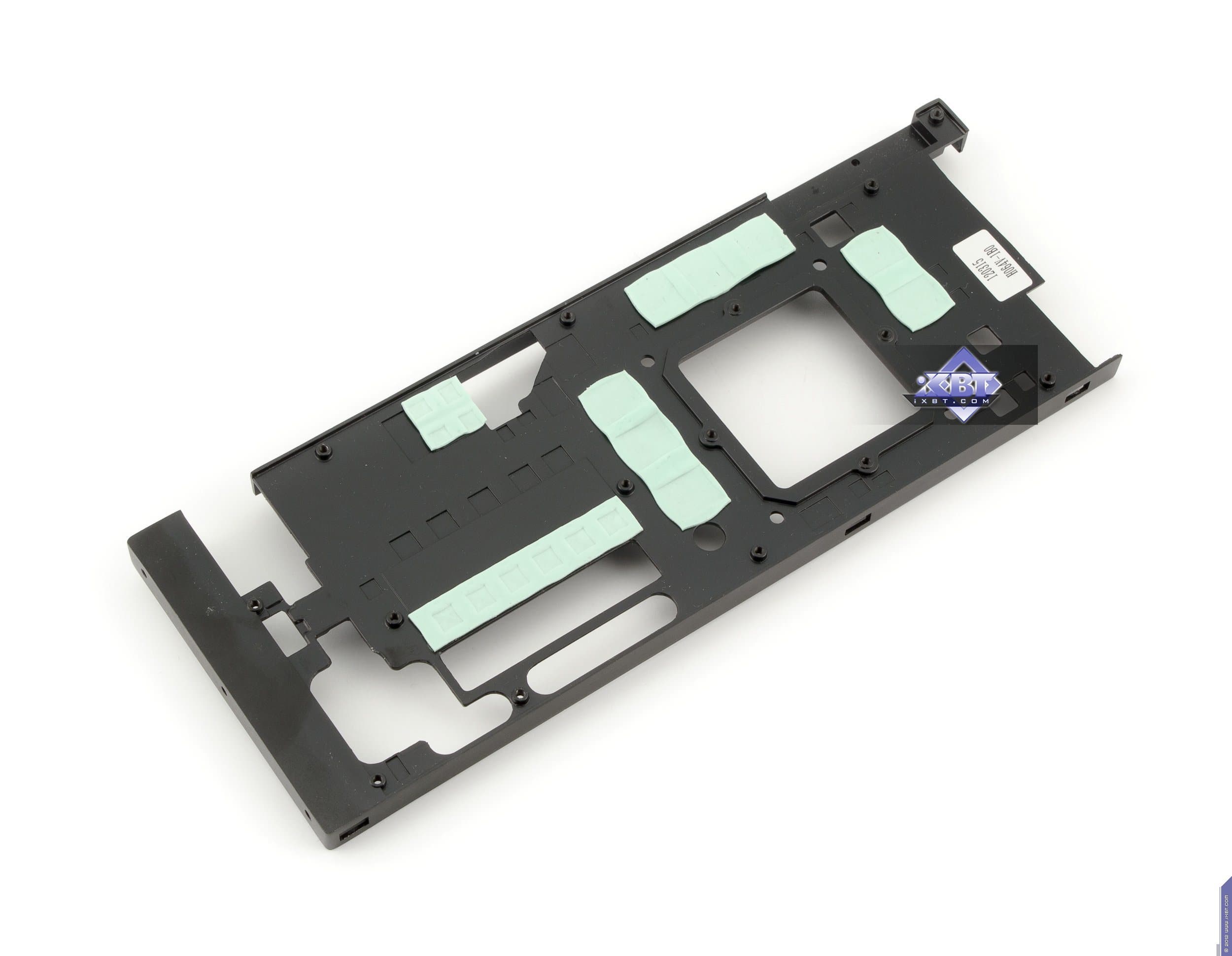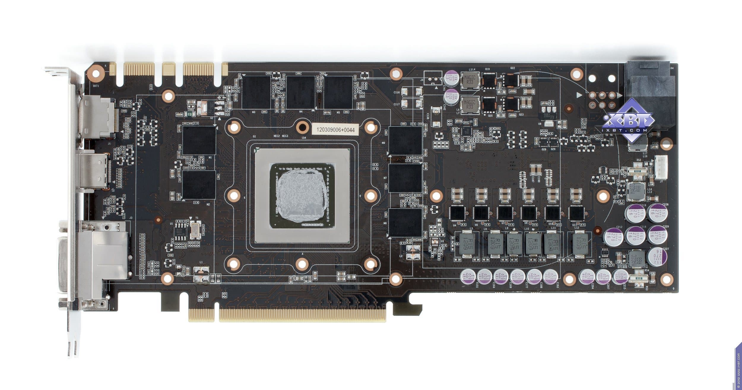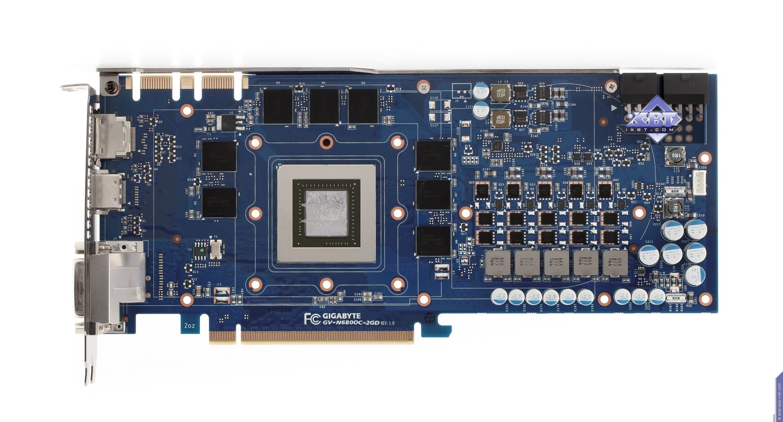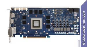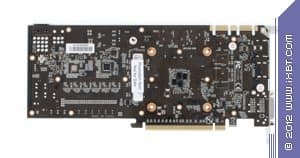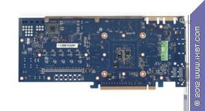 Начнем с продукта Gigabyte. Инженеры не стали что-либо менять в эталонном дизайне и выпустили карту с полной копией референс-дизайна. Отличие в том, что в качестве основы взяли фирменную печатную плату Durable, которая обладает бо́льшим количеством слоев, однако все элементы медные, поэтому PCB нагревается меньше обычного. А также мы видим, что если на референсе силовой блок использует 4 фазы для GPU (место под пятую фазу распаяно, но не используется) и 2 фазы для модулей памяти, то на продукте Gigabyte блок питания GPU — 5-фазный, что дает возможность более гибко манипулировать частотами работы карты в целом. Питанием по-прежнему управляет контроллер Richtek RT8802A, расположенный на оборотной стороне PCB. Мы еще можем лицезреть, что наконец-то установили стандартные разъемы питания на PCB (тот двухэтажный разъем на референс-карте очень неприятен для тестеров, ибо можно пальцы сломать, пока нажмешь оба замка штекеров питания, расположенных внутри того разъема). Обратим внимание на то, что набор разъемов уже 8+6, а не 6+6, как на референс-карте, что опять-таки говорит о повышенном оверклокерском потенциале карты в целом. Поэтому у потенциального потребителя Gigabyte Geforce GTX 680 OC должен быть либо системный блок питания с 8-контактным «хвостом», либо надо использовать переходники-разветвители питания. Разумеется, по умолчанию необходимо наличие блока питания с 6-контактными «хвостами» для видеокарт, и весьма приличной мощности. Если такового нет, то незачем покупать топовый 3D-ускоритель.