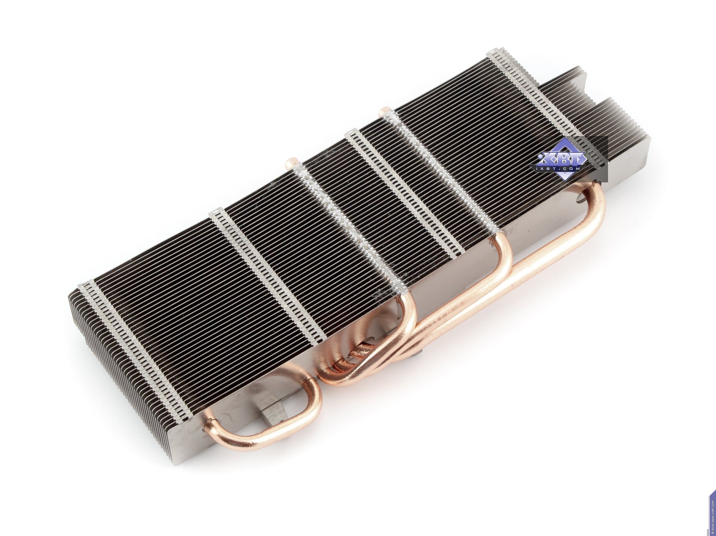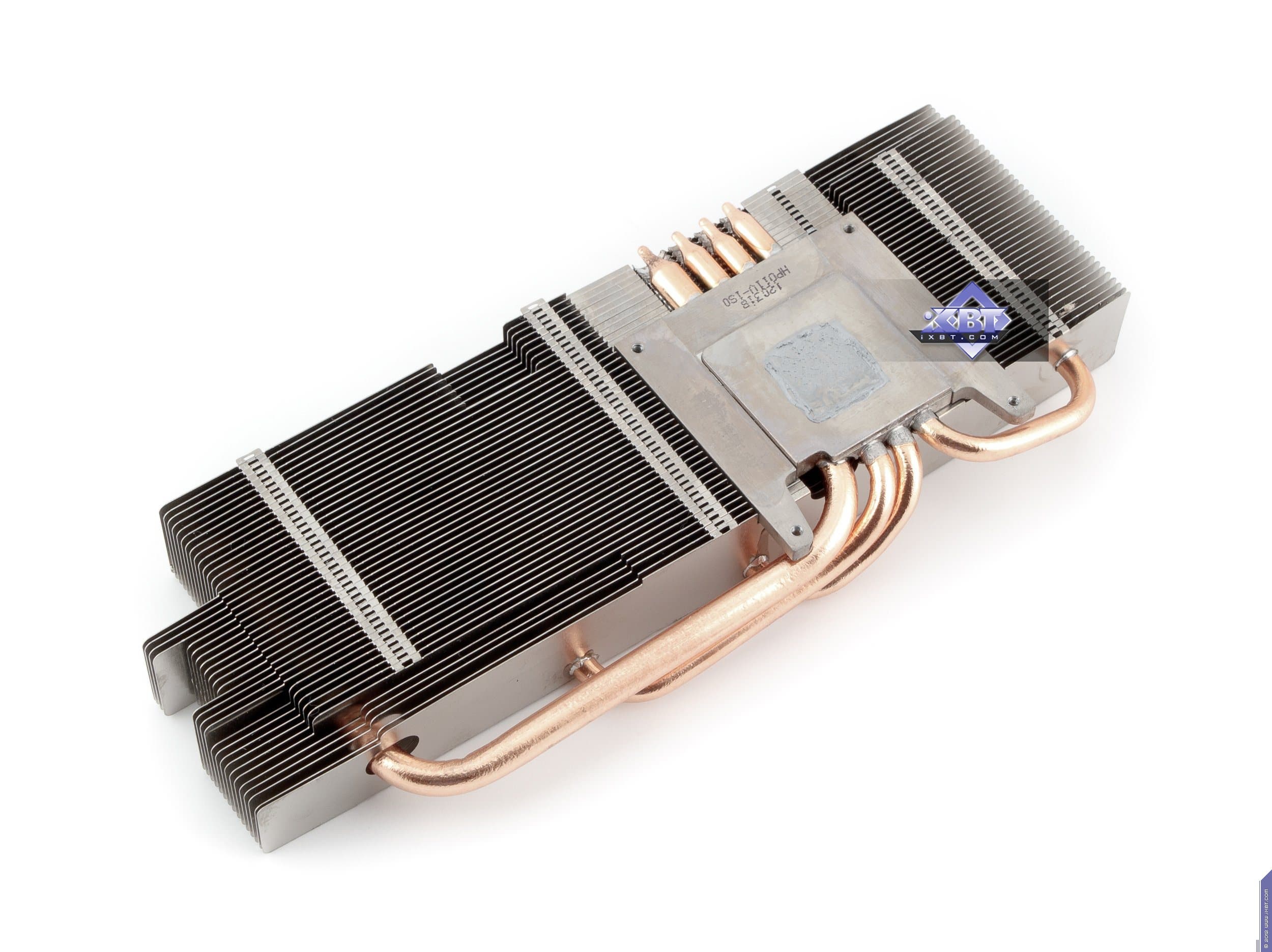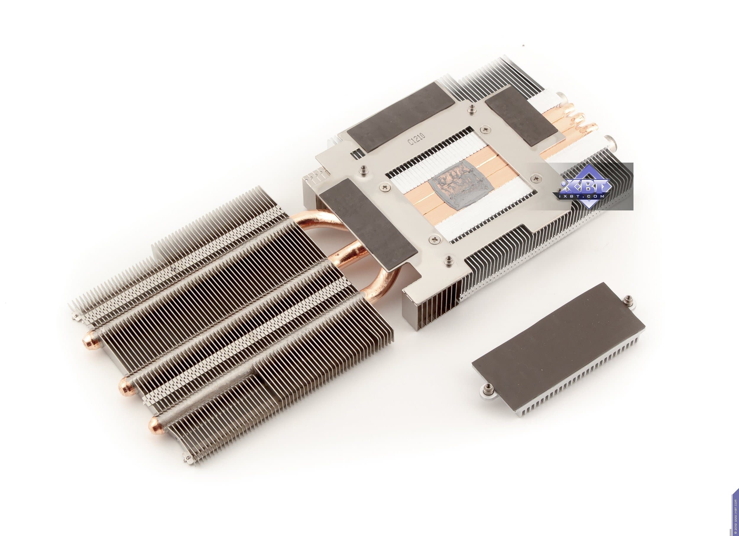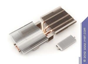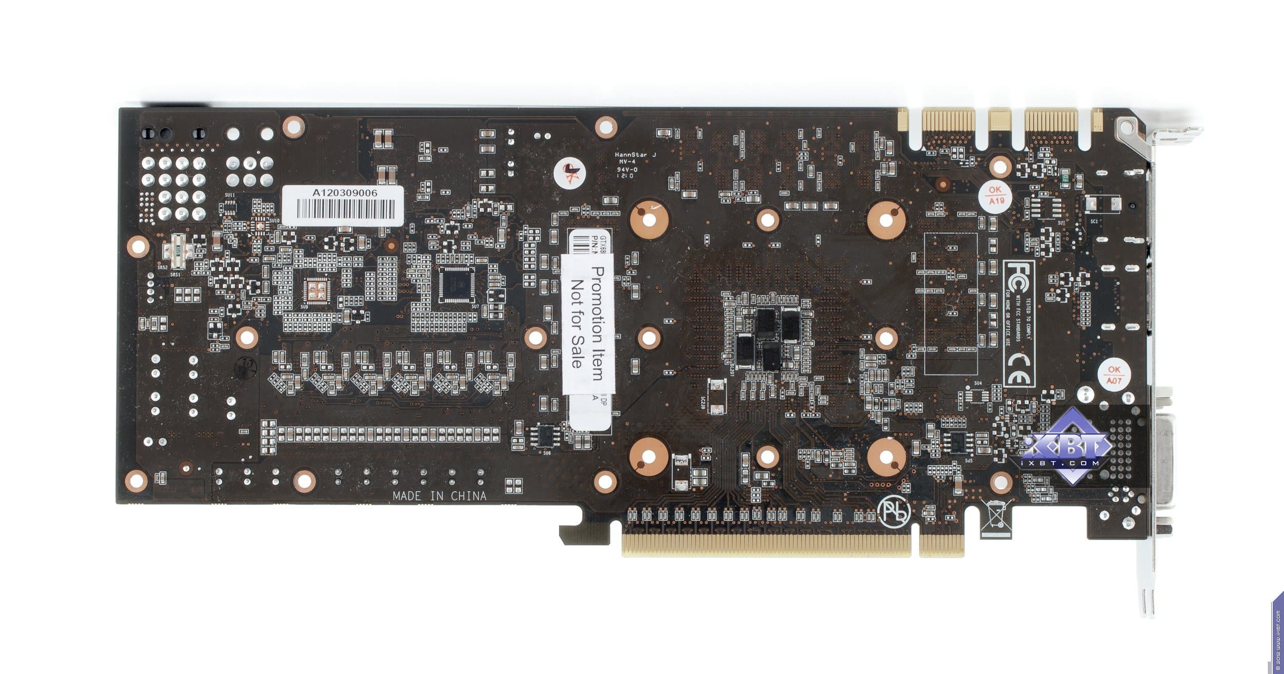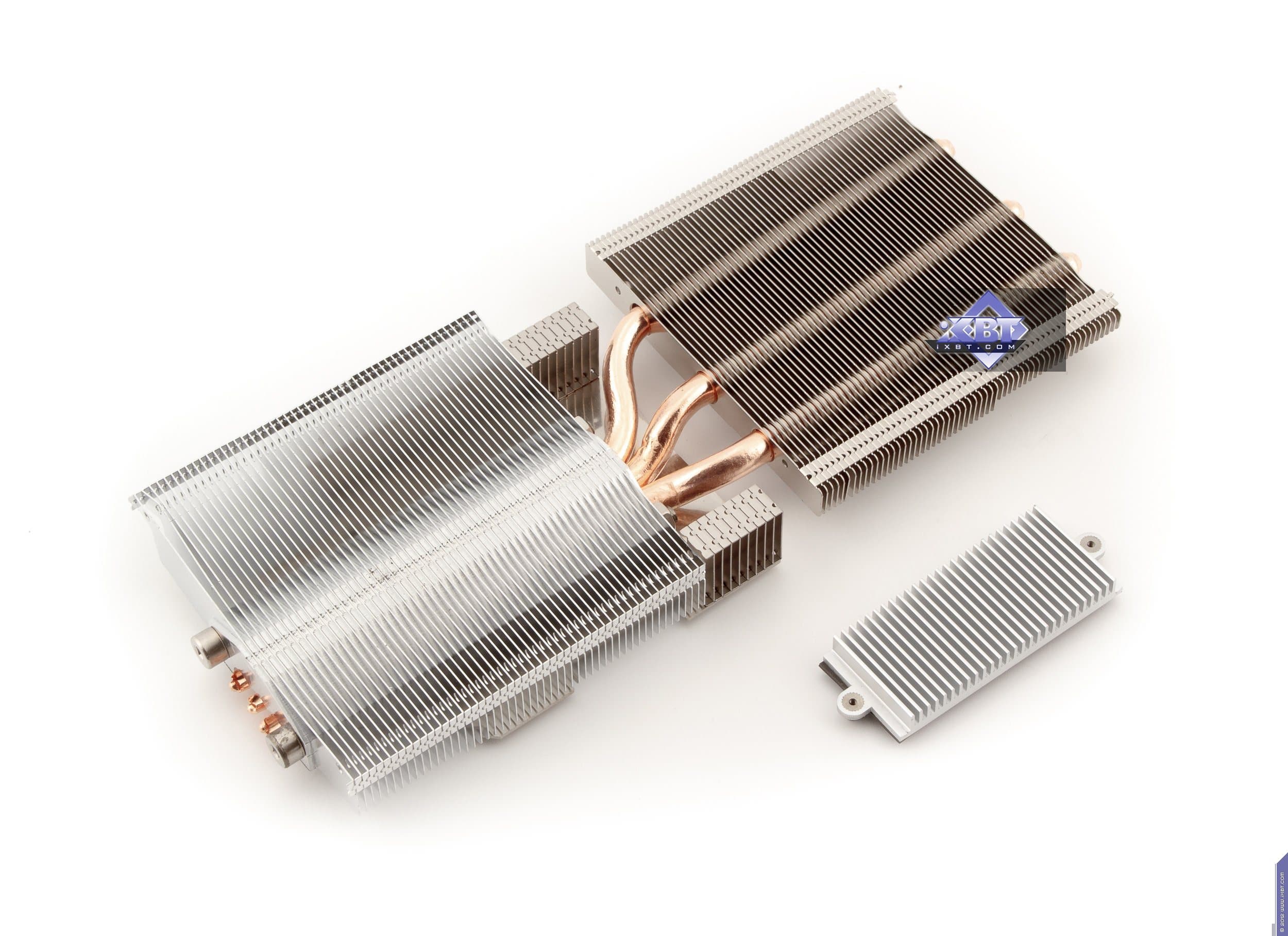 Начнем с продукта Gigabyte. Инженеры не стали что-либо менять в эталонном дизайне и выпустили карту с полной копией референс-дизайна. Отличие в том, что в качестве основы взяли фирменную печатную плату Durable, которая обладает бо́льшим количеством слоев, однако все элементы медные, поэтому PCB нагревается меньше обычного. А также мы видим, что если на референсе силовой блок использует 4 фазы для GPU (место под пятую фазу распаяно, но не используется) и 2 фазы для модулей памяти, то на продукте Gigabyte блок питания GPU — 5-фазный, что дает возможность более гибко манипулировать частотами работы карты в целом. Питанием по-прежнему управляет контроллер Richtek RT8802A, расположенный на оборотной стороне PCB. Мы еще можем лицезреть, что наконец-то установили стандартные разъемы питания на PCB (тот двухэтажный разъем на референс-карте очень неприятен для тестеров, ибо можно пальцы сломать, пока нажмешь оба замка штекеров питания, расположенных внутри того разъема). Обратим внимание на то, что набор разъемов уже 8+6, а не 6+6, как на референс-карте, что опять-таки говорит о повышенном оверклокерском потенциале карты в целом. Поэтому у потенциального потребителя Gigabyte Geforce GTX 680 OC должен быть либо системный блок питания с 8-контактным «хвостом», либо надо использовать переходники-разветвители питания. Разумеется, по умолчанию необходимо наличие блока питания с 6-контактными «хвостами» для видеокарт, и весьма приличной мощности. Если такового нет, то незачем покупать топовый 3D-ускоритель.