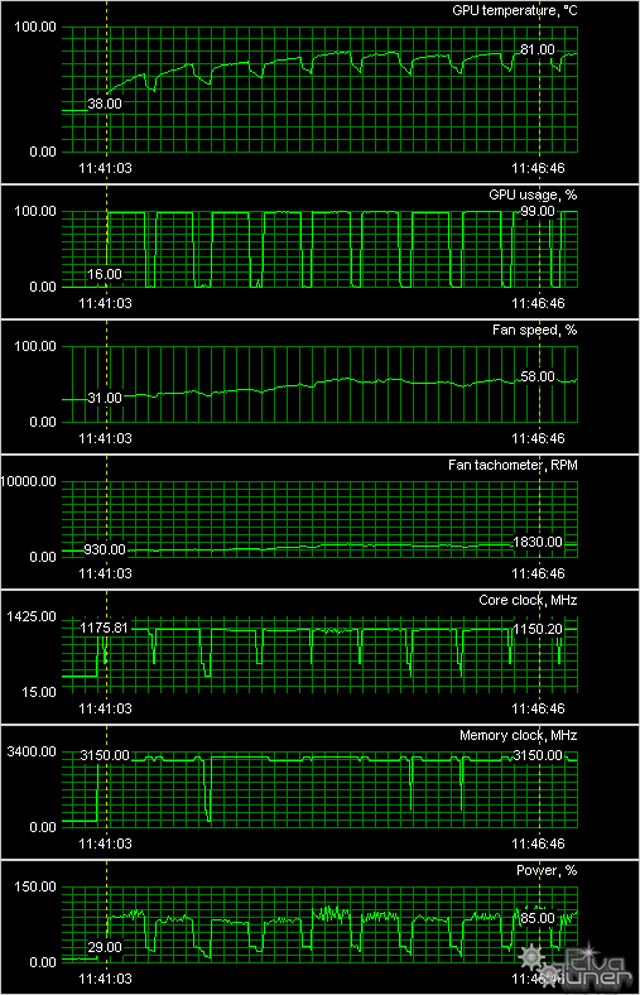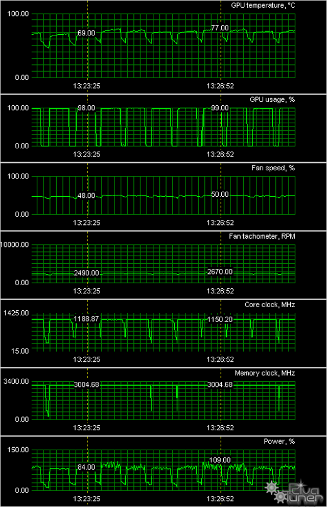 В обоих случаях температура ядра не превышает 81 градус, что для топового уровня продукта является очень хорошим результатом. При этом эффективность СО у Gigabyte выше. Обратим внимание на то, что частота вращения вентиляторов у Gigabyte выше, чем у их аналогов в случае Palit, но тем не менее, СО Palit — более шумная. На графиках поставлены по две метки: одна на максимальной температуре ядра, а вторая на максимальной частоте работы карты. Собственно, можно увидеть, что эта частота устанавливается драйвером, и ею управлять практически нереально.