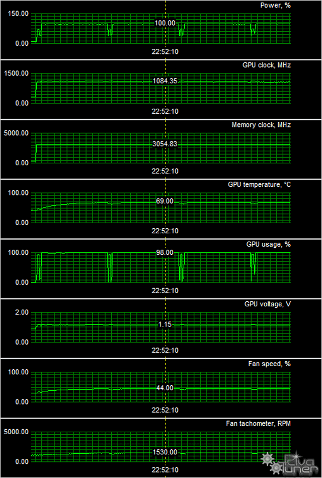 После 6-часового прогона под нагрузкой мы видим, что максимальная температура не превысила 69 градусов, что для такого рода ускорителя является просто отличным результатом.