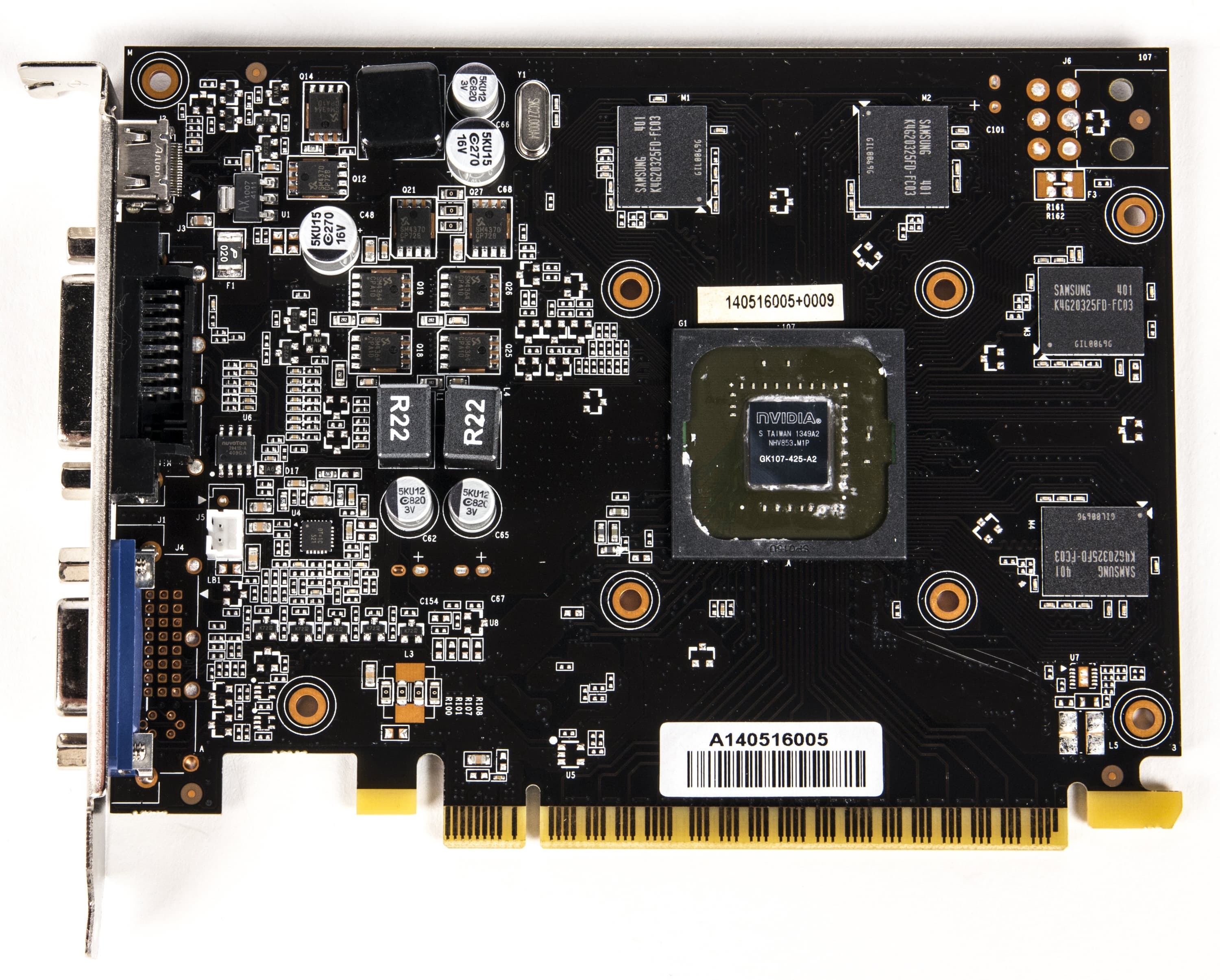 Очевидно, что карта GT 740 спроектирована на основе GTX 650, ведь ядро одно и то же, разница лишь в частотах работы. Также GTX 650 поддерживает 2 гигабайта памяти (8 микросхем памяти, по 4 с каждой стороны PCB), а в данном случае распаян лишь 1 гигабайт, и оборотная сторона пуста. В принципе, карта очень простая, да и должна быть такой. По наследству от GTX 650 ей досталась схема питания, рассчитанная на использование внешней дополнительной подпитки через 6-контактный разъем, однако в данном случае он не используется, потребление карты ниже 75 Вт, поэтому все материнские платы с PCI-E смогут обеспечить необходимое питание через слот.