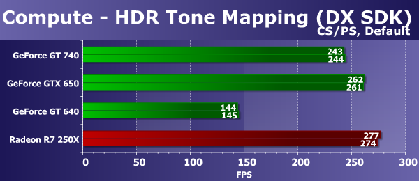 Сначала мы рассмотрим тесты, использующие вычислительные (Compute) шейдеры. Их появление — одно из наиболее важных нововведений в последних версиях DX API, они уже используются в современных играх для выполнения различных задач: постобработки, симуляций и т. п. В первом тесте показан пример HDR-рендеринга с tone mapping из DirectX SDK, с постобработкой, использующей пиксельные и вычислительные шейдеры.