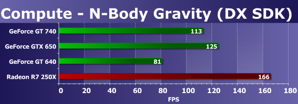 Платы Geforce в подобных расчетных задачах обычно смотрятся неплохо, но не в этот раз. Во-первых, новые Radeon также хорошо выглядят, а во-вторых — в GK107 слишком мало геометрических блоков, чтобы получить преимущество. В общем, в этом тесте победила единственная видеокарта AMD, а Geforce GT 740 оказалась лишь третьей — позади GTX 650 на 10%, что близко к теории.