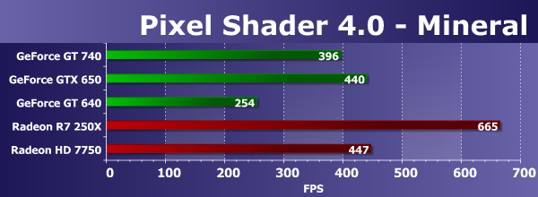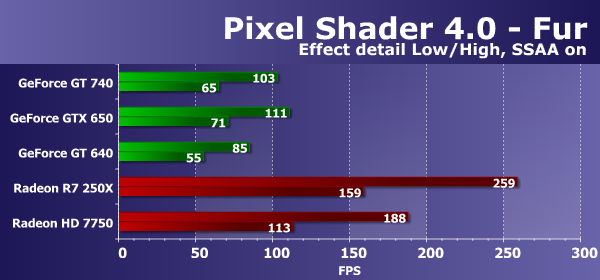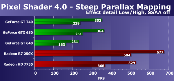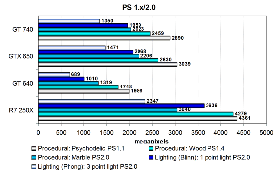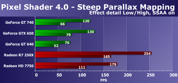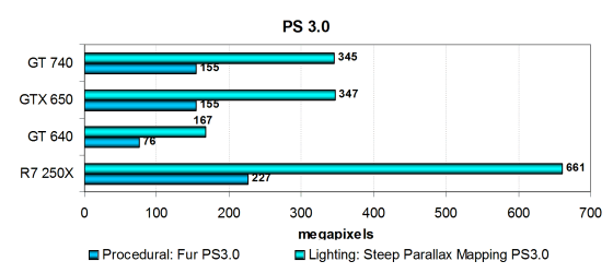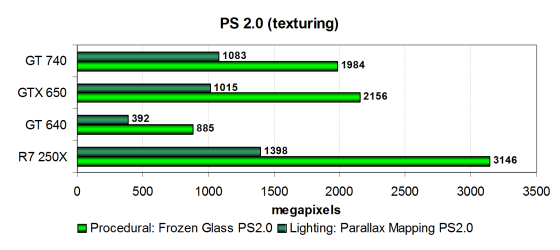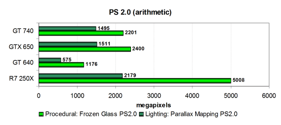 Во втором подтесте со сложными попиксельными расчетами новинка вдвое уступила Radeon R7 250X, ведь эффективность выполнения таких математических вычислений в пиксельных шейдерах у чипов архитектуры GCN заметно выше, чем у Kepler. Интересно, что если сравнивать новую модель GT 740 со старой GTX 650, которая мощнее теоретически, то мы видим небольшое несоответствие теории — новинка оказалась чуть быстрее.