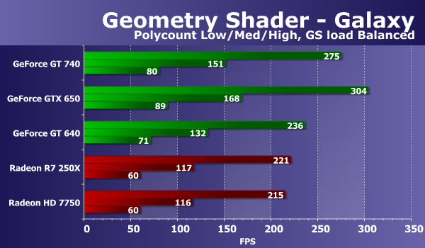 При изменении нагрузки в этом тесте цифры слегка улучшились и для плат AMD и для решений Nvidia, но разница невелика. Видеокарты в этом тесте геометрических шейдеров слабо реагируют на изменение параметра GS load, отвечающего за перенос части вычислений в геометрический шейдер, поэтому и выводы остаются прежними. Новинка Nvidia быстрее аналогичной модели прошлого поколения и уступает GTX 650 где-то 9-10%. Да и в остальном в выводах ничего не изменилось, платы Geforce быстрее обеих Radeon.