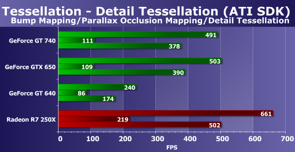 В тесте простого бампмаппинга скорость плат не слишком важна, так как эта задача стала слишком легкой даже для сравнительно маломощных решений. Сегодняшний герой обзора — уступает Geforce GTX 650 совсем немного, да и Radeon R7 250X также оказался впереди. Ну а самой слабой стала Geforce GT 640 по понятным причинам.