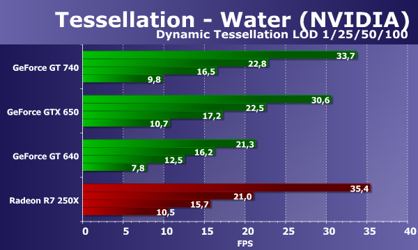 Мы тестируем все видеоплаты при четырех разных коэффициентах тесселяции — в данном случае настройка называется Dynamic Tessellation LOD. Обычно, при первом коэффициенте разбиения треугольников, скорость не ограничена производительностью геометрических блоков, и видеокарты Radeon от компании AMD показывают достаточно высокие результаты, а в следующих ступенях нагрузки начинают уступать скорости плат Nvidia, так как производительность всех Radeon снижается заметнее.
