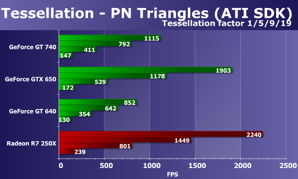 Скорость рендеринга в этом тесте обычно зависит сразу от нескольких параметров, а основными факторами влияния должны являться производительность обработки геометрии и эффективность выполнения геометрических шейдеров. То есть, сильные стороны чипов Nvidia должны бы проявиться именно тут. Но нет, новая бюджетная модель компании Nvidia и тут показала не слишком высокую скорость. Да, она уступила GTX 650 лишь 9%, что близко к теории, и опередила GT 640, но сравнивать ее нужно с платами Radeon.