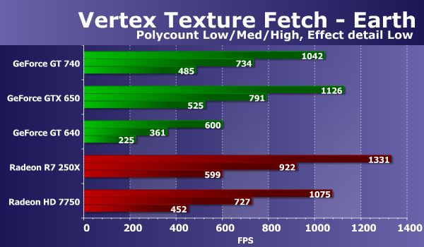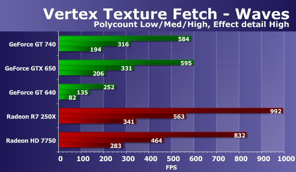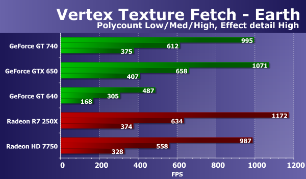 В тестах «Vertex Texture Fetch» измеряется скорость большого количества текстурных выборок из вершинного шейдера. Тесты схожи, по сути, так что соотношение между результатами карт в тестах «Earth» и «Waves» должно быть примерно одинаковым. В обоих тестах используется displacement mapping на основании данных текстурных выборок, единственное существенное отличие состоит в том, что в тесте «Waves» используются условные переходы, а в «Earth» — нет.
