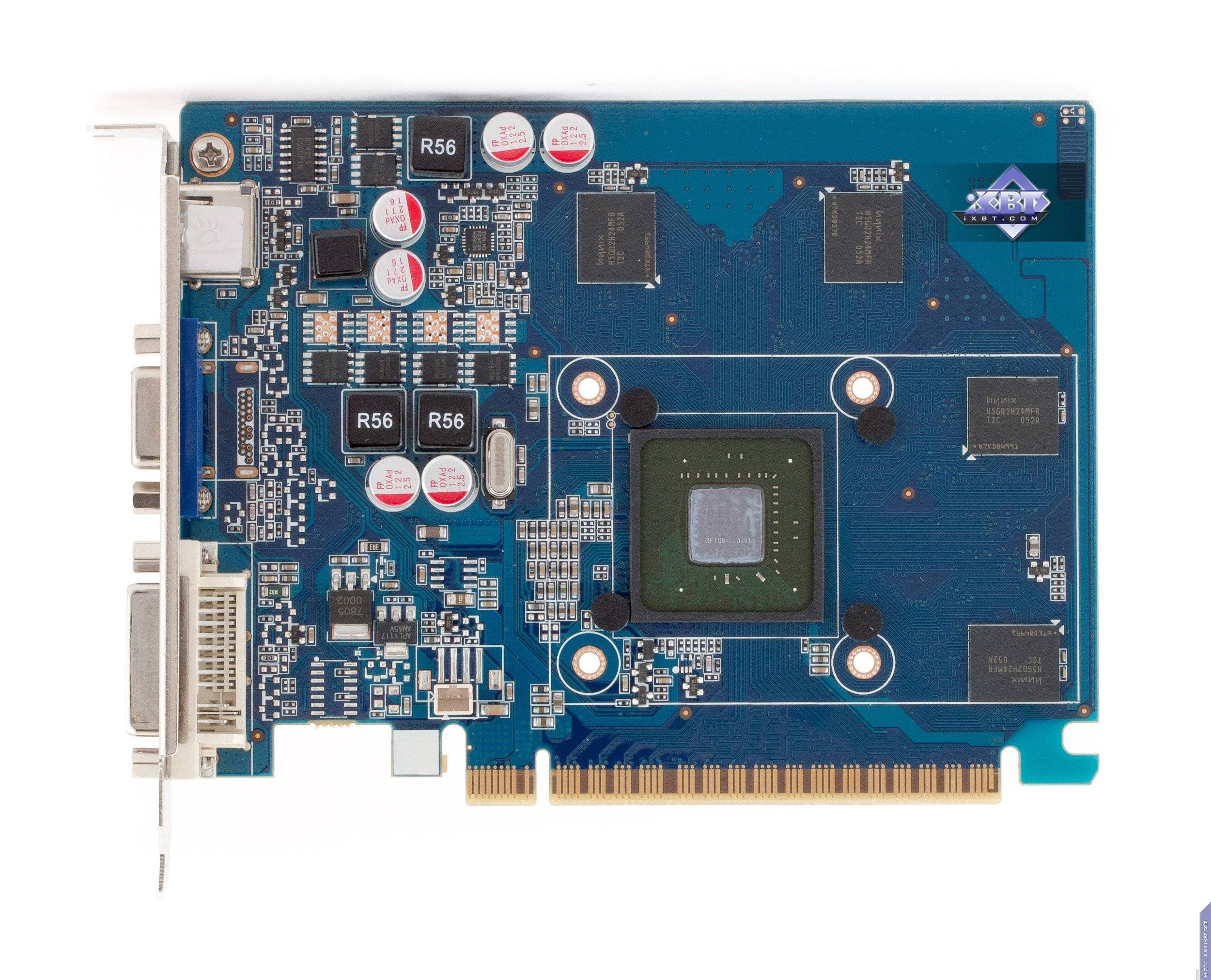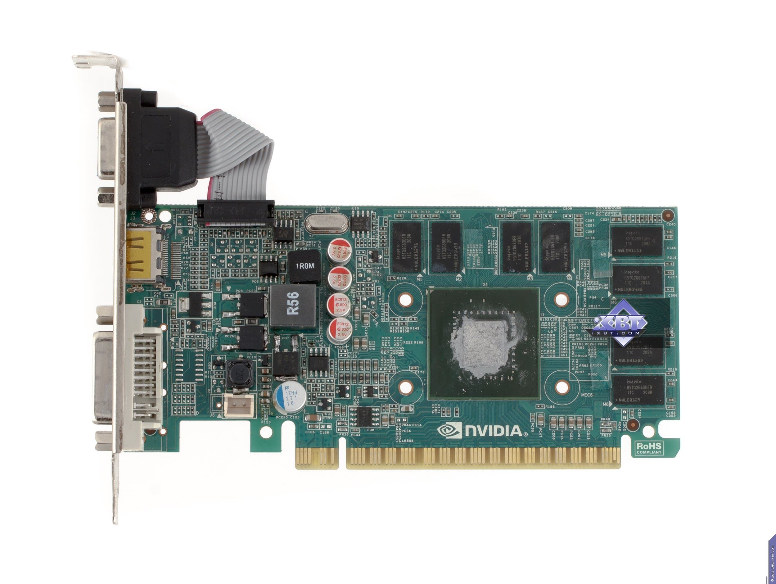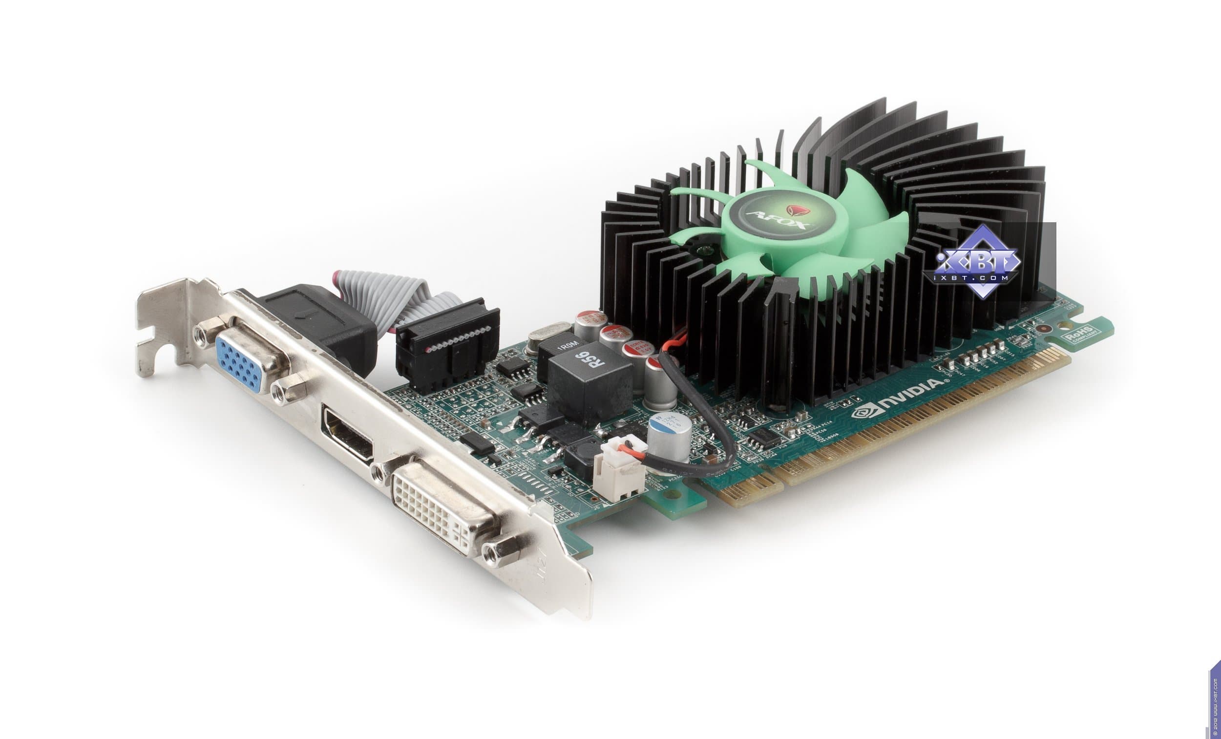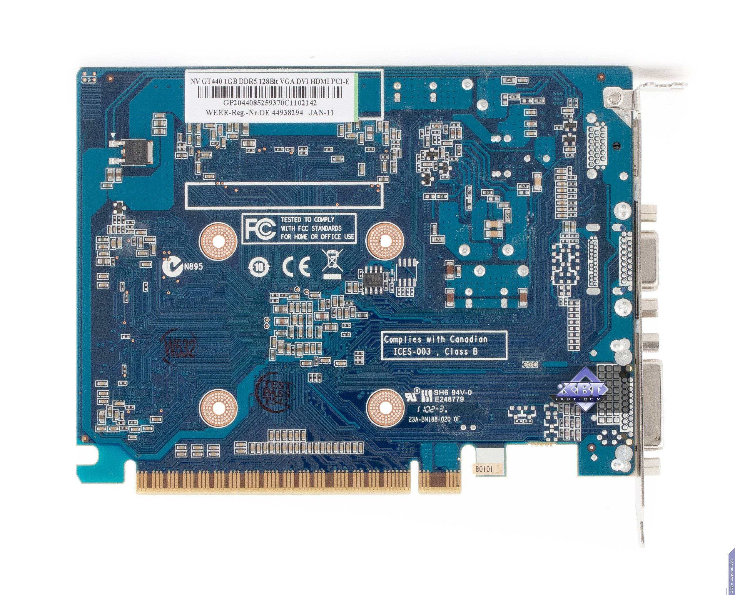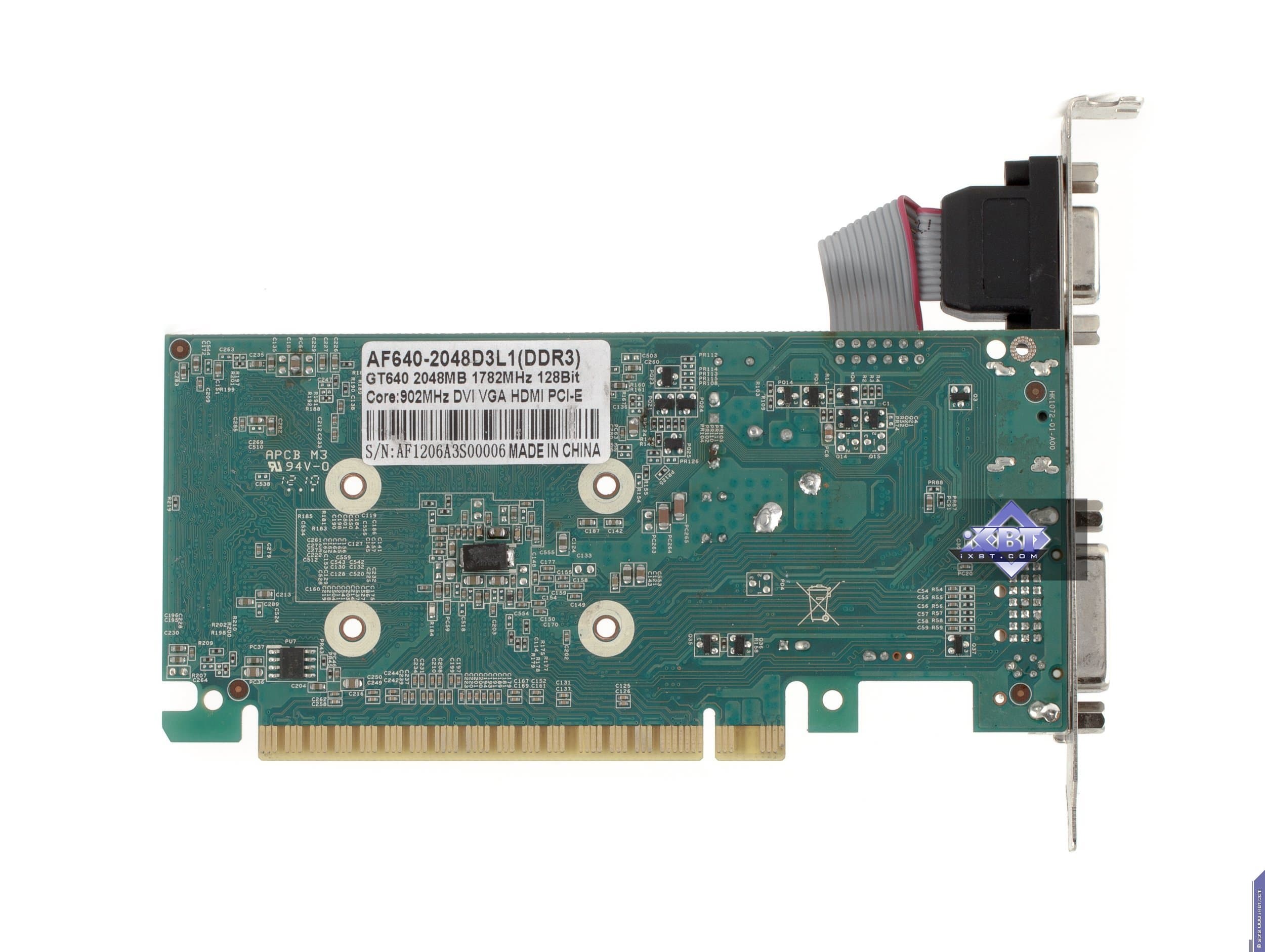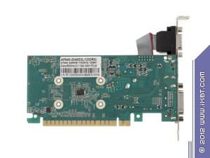 Как мы видим, PCB у GT 640 весьма маленькая, карта изначально раcсчитана на возможность установки в низкопрофильные системные блоки, потому что верхний VGA-разъем съемный и может быть демонтирован, а брэкет заменен на низкопрофильный, который имеется в комплекте поставки. Когда как эталонный вариант GT 440 предусматривал полноформатные размеры. Карта компании AFox имеет 6 микросхем памяти, это связано с тем, что она укомплектована 2 гигабайтами памяти (такой объем невозможно разместить в четырех микросхемах, а вот для 128-битной шины достаточно именно такого количества микросхем). Разумеется, это чисто маркетинговый ход: уже даже не очень опытному пользователю понятно, что такой объем памяти на подобного рода слабых по производительности ускорителях будет не востребован, тут даже гигабайт памяти будет не весь задействован, потому что играть все равно придется в низких разрешениях либо понижать уровень настроек качества в играх, что также снижает потребность в объеме локальной памяти.