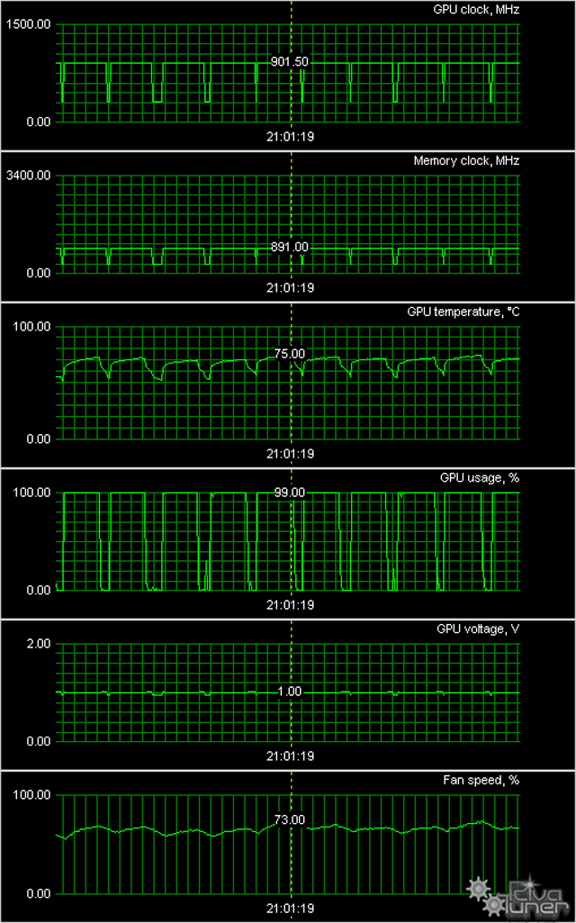 Мы провели исследование температурного режима с помощью утилиты MSI Afterburner (автор А. Николайчук AKA Unwinder) и получили следующие результаты: