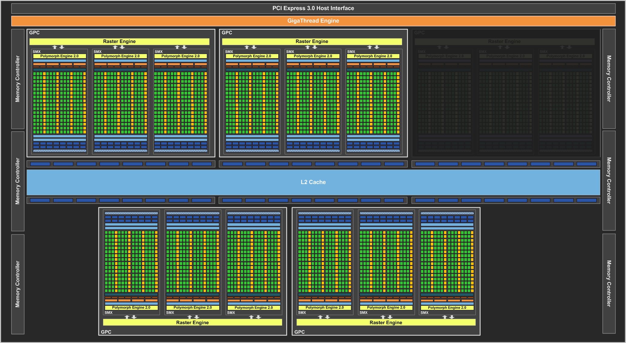 Так как в основе Geforce GTX 780 лежит урезанная версия графического чипа GK110, то не все из блоков физически включены и работают. Так, GPU в этой модели содержит лишь 12 активных SMX-блоков, что в целом даёт нам 2304 потоковых вычислительных ядра. А уж какие конкретно блоки SMX отключены — неизвестно. Поэтому активных кластеров GPC (а вместе с ними и количество движков растеризации) может быть или 4, или 5, в зависимости от того, в одном кластере находятся отключённые три мультипроцессора SMX или нет.